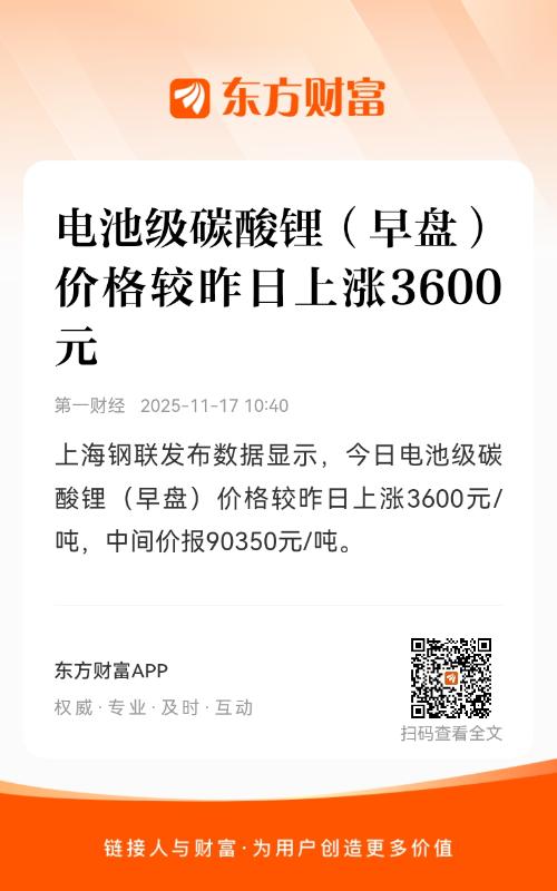 上海钢联发布数据显示,今日电池级碳酸锂(早盘)价格较昨日上涨3600元/吨,中间价报90350元/吨。