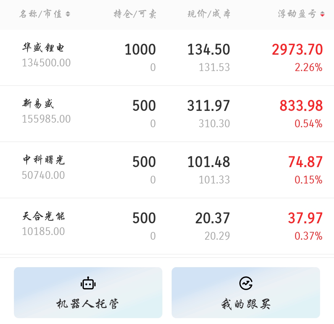 今天开盘1小时果断布局4只赛道核心标的,目前浮盈合计约4500元——华盛锂电、新易盛、中科曙光、天合光能,每只都是“行业逻辑+技术信号”双重验证后的选择,分享下底层思路: