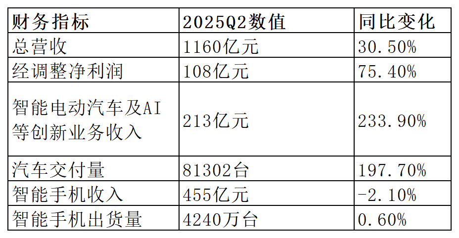 小米2025年第二季度财报表现强劲,总营收达1160亿元,同比增长30.5%;经调整净利润为108亿元,同比大幅增长75.4%。增长主要得益于智能电动汽车等创新业务的爆发。