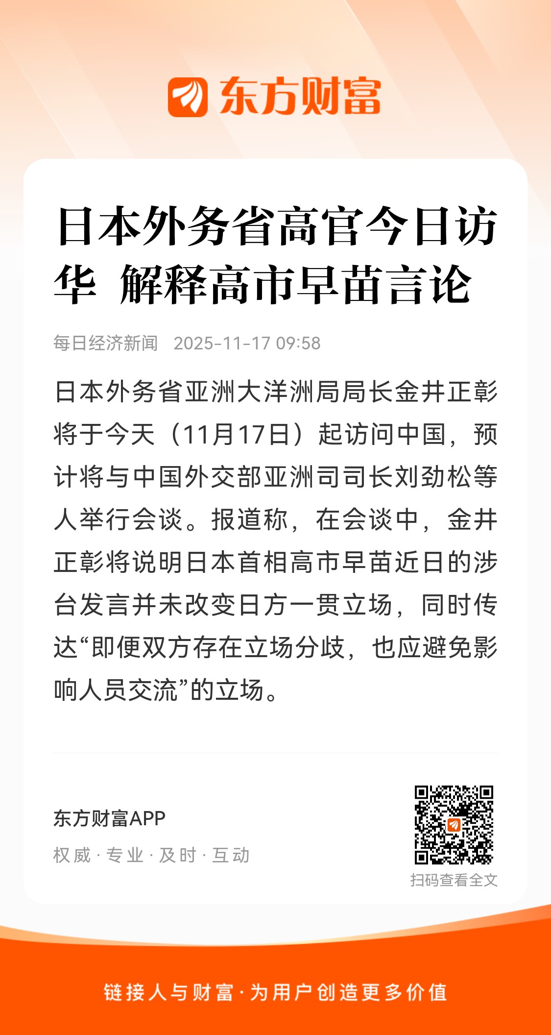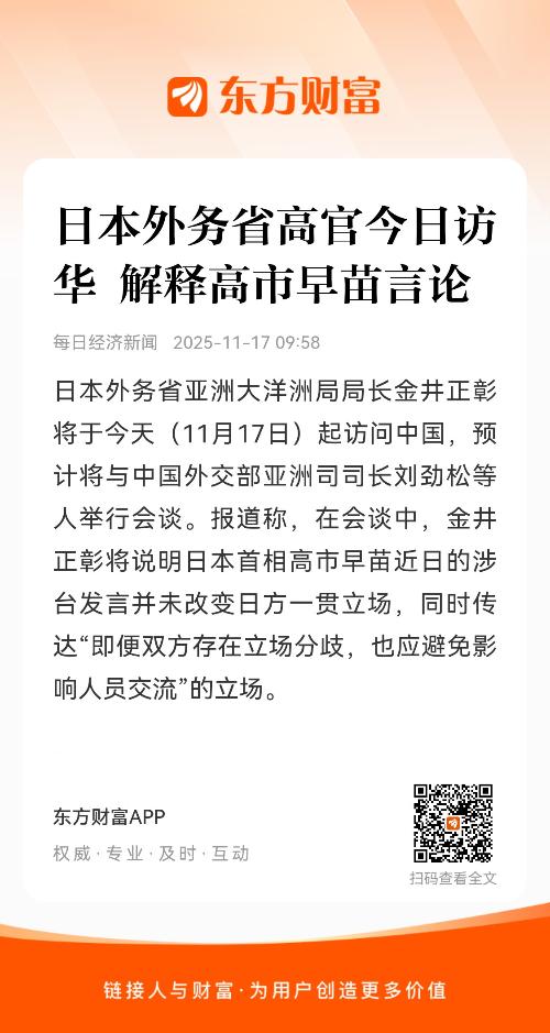 据日本广播协会(NHK)报道,日本外务省亚洲大洋洲局局长金井正彰将于今天(11月17日)起访问中国,预计将与中国外交部亚洲司司长刘劲松等人举行会谈。报道称,在会谈中,金井正彰将说明日本首相高市早苗近日的涉台发言并未改变日方一贯立场,同时传达“即便双方存在立场分歧,也应避免影响人员交流”的立场。
