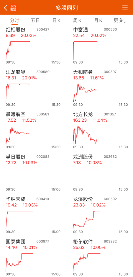 今日早盘,军工和水产板块携手走强,中富通、江龙船艇、红相股份20cm涨停,中水渔业、开创国际、长城军工、航天发展等十余股亦封板,晨曦航空、天和防务、北方长龙、国联水产等均涨超10%。