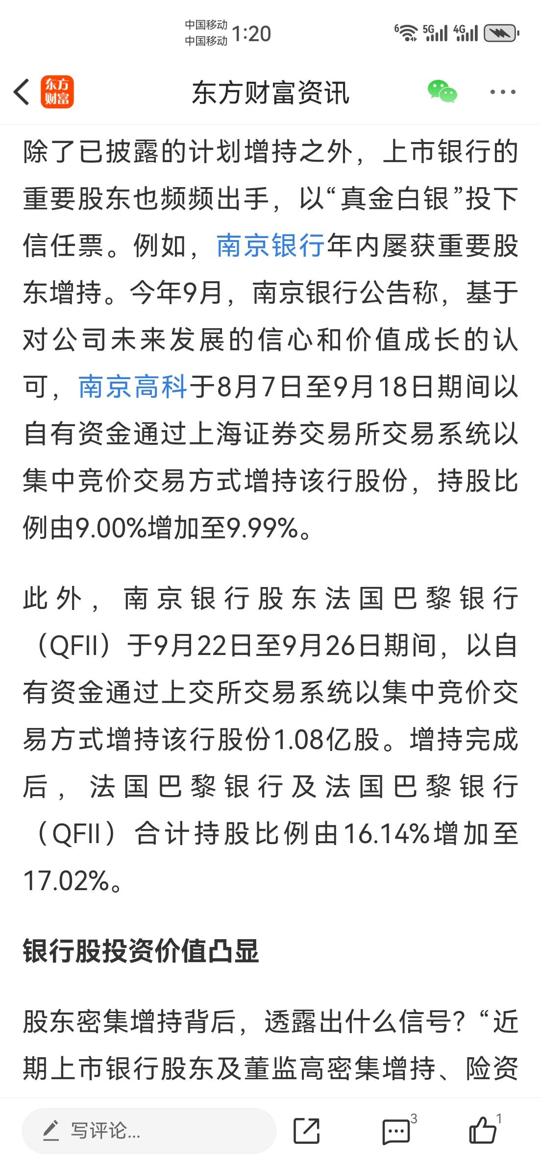 此外,南京银行股东法国巴黎银行(QFII)于9月22日至9月26日期间,以自有资金通过上交所交易系统以集中竞价交易方式增持该行股份1.08亿股。增持完成后,法国巴黎银行及法国巴黎银行(QFII)合计持股比例由16.14%增加至17.02%。