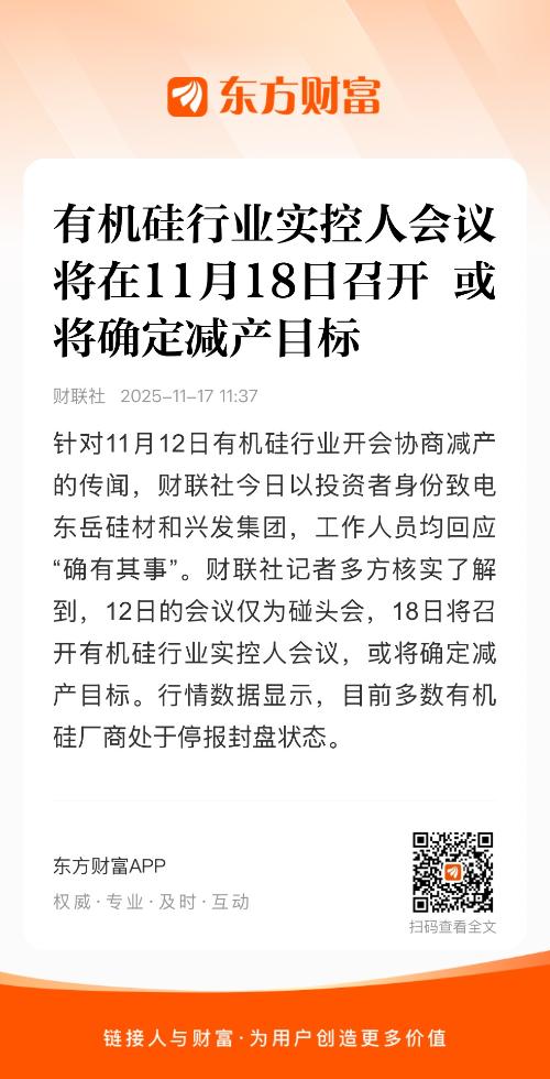 针对11月12日有机硅行业开会协商减产的传闻,财联社今日以投资者身份致电东岳硅材和兴发集团,工作人员均回应“确有其事”。财联社记者多方核实了解到,12日的会议仅为碰头会,18日将召开有机硅行业实控人会议,或将确定减产目标。行情数据显示,目前多数有机硅厂商处于停报封盘状态。