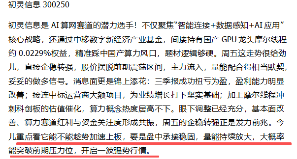 初灵信息是AI算网赛道的潜力选手!不仅聚焦“智能连接+数据感知+AI应用”核心战略,还通过中移数字新经济产业基金,间接持有国产GPU龙头摩尔线程约0.0229%权益,精准踩中国产算力风口,题材逻辑够硬。该股作为具备核心竞争力的科技类标的,今日表现格外亮眼,如期实现转强向上,盘中涨幅一度超10%。其走势强势态势凸显,成功启动修复性行情,且量价配合度颇高,股价已稳步重回多条均线上方,转强信号愈发清晰。盘中已顺势介入布局,从当前走势及基本面支撑来看,后续大概率延续这波修复行情。$初灵信息(SZ300250)$