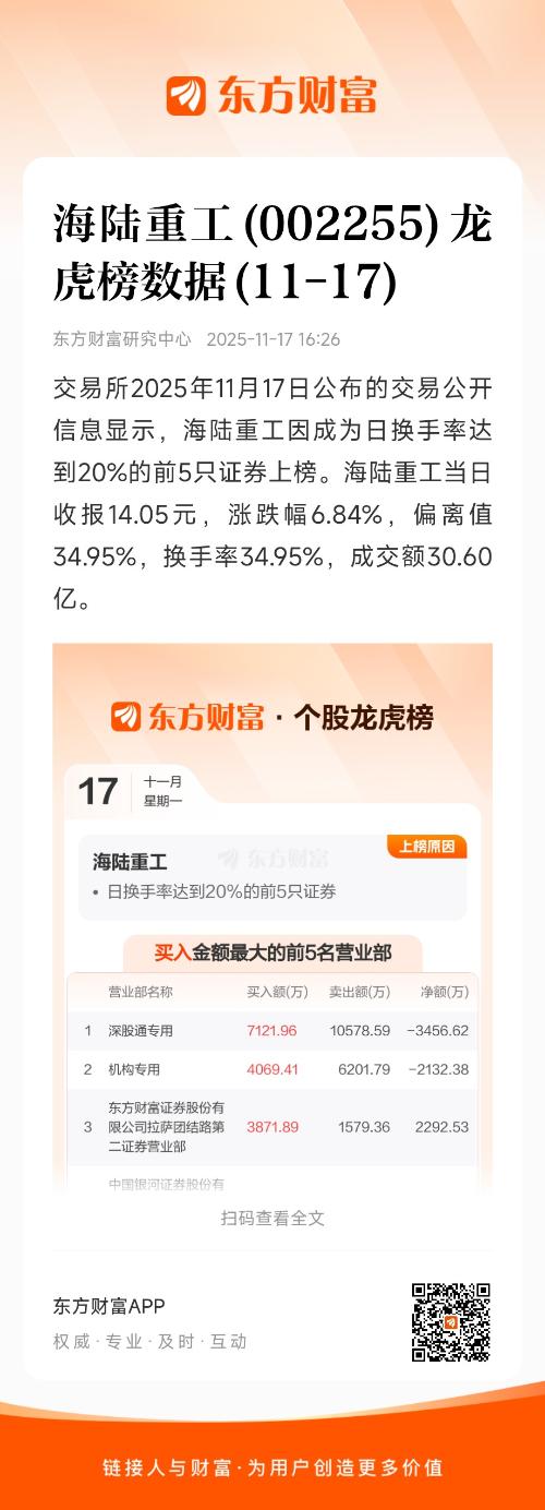 交易所2025年11月17日公布的交易公开信息显示,海陆重工因成为日换手率达到20%的前5只证券上榜。海陆重工当日收报14.05元,涨跌幅6.84%,偏离值34.95%,换手率34.95%,成交额30.60亿。
