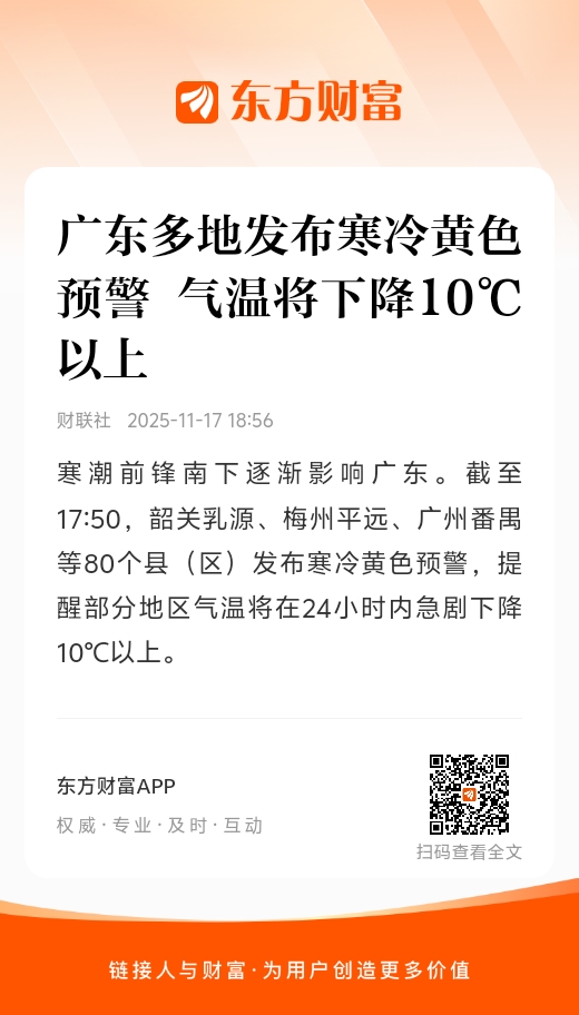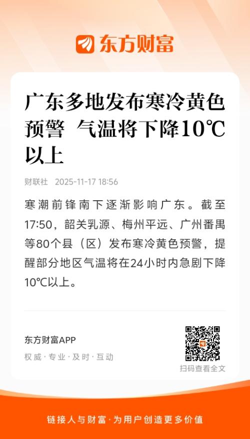 寒潮前锋南下逐渐影响广东。截至17:50,韶关乳源、梅州平远、广州番禺等80个县(区)发布寒冷黄色预警,提醒部分地区气温将在24小时内急剧下降10℃以上,民众需注意添衣保暖,对热带作物及水产养殖品应采取一定的防寒和防风措施,在生产上要做好对寒潮大风天气的防御准备等。