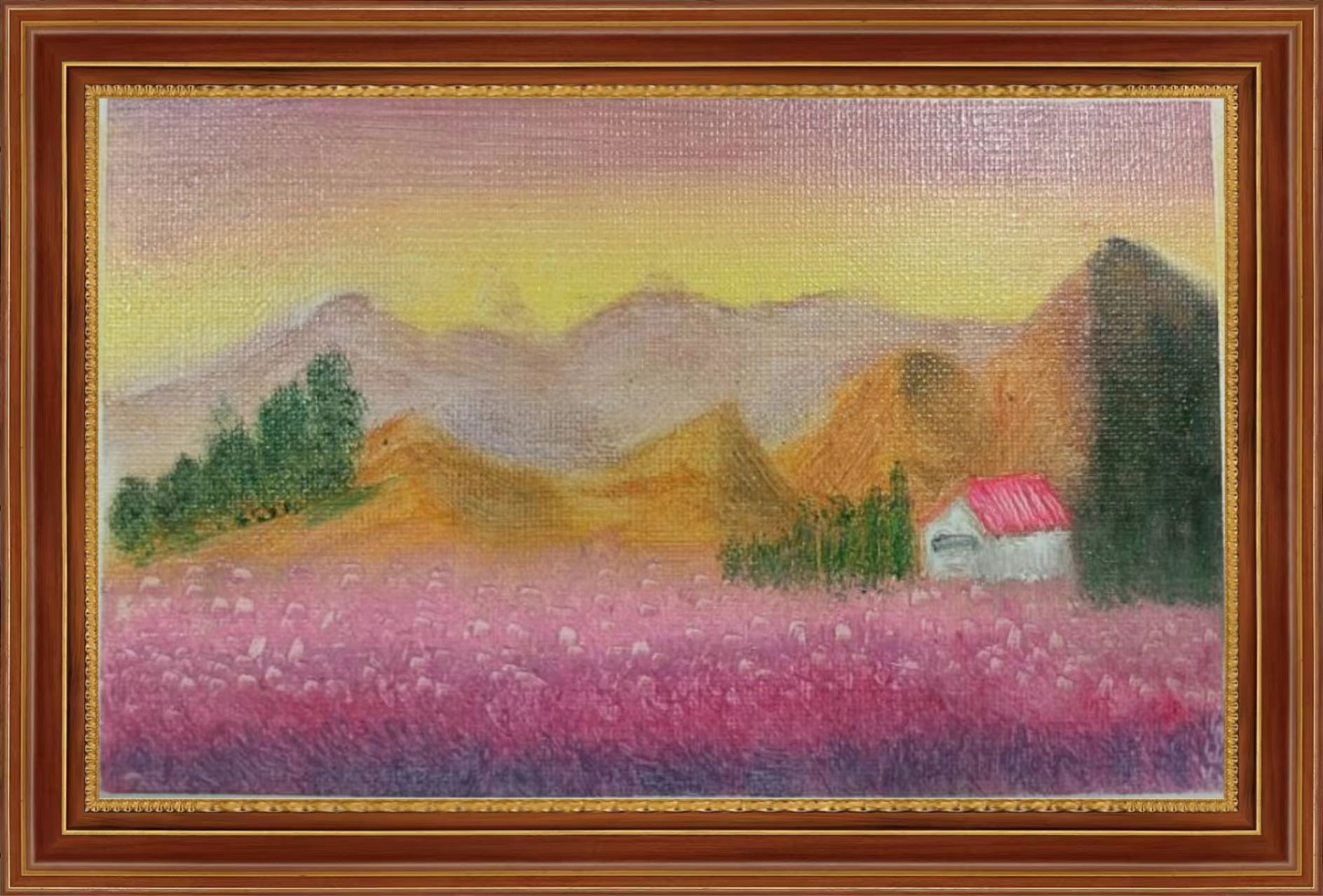 紫韵黄昏铺底,金色山脉映暖阳,粉红花海绕绿树,小房卧在柔光里。