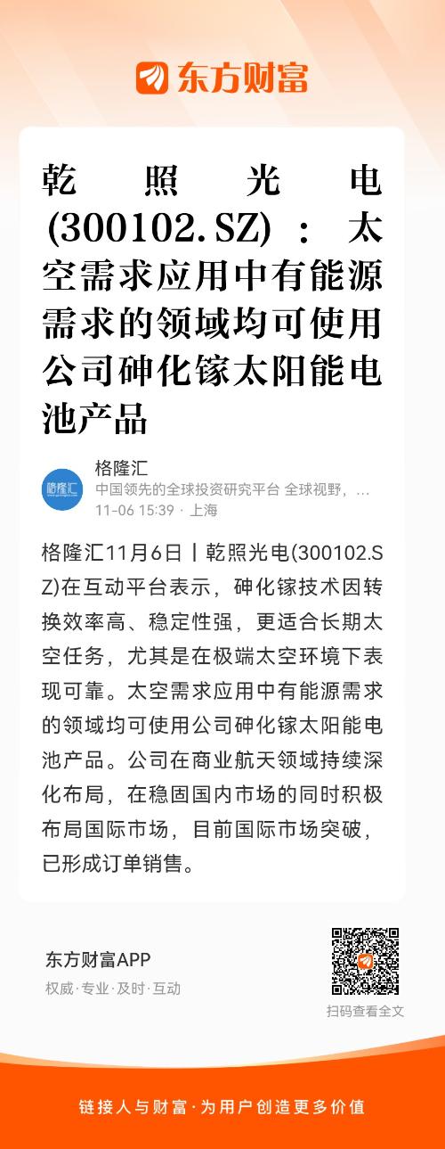 格隆汇11月6日丨乾照光电(300102.SZ)在互动平台表示,砷化镓技术因转换效率高、稳定性强,更适合长期太空任务,尤其是在极端太空环境下表现可靠。太空需求应用中有能源需求的领域均可使用公司砷化镓太阳能电池产品。公司在商业航天领域持续深化布局,在稳固国内市场的同时积极布局国际市场,目前国际市场突破,已形成订单销售。