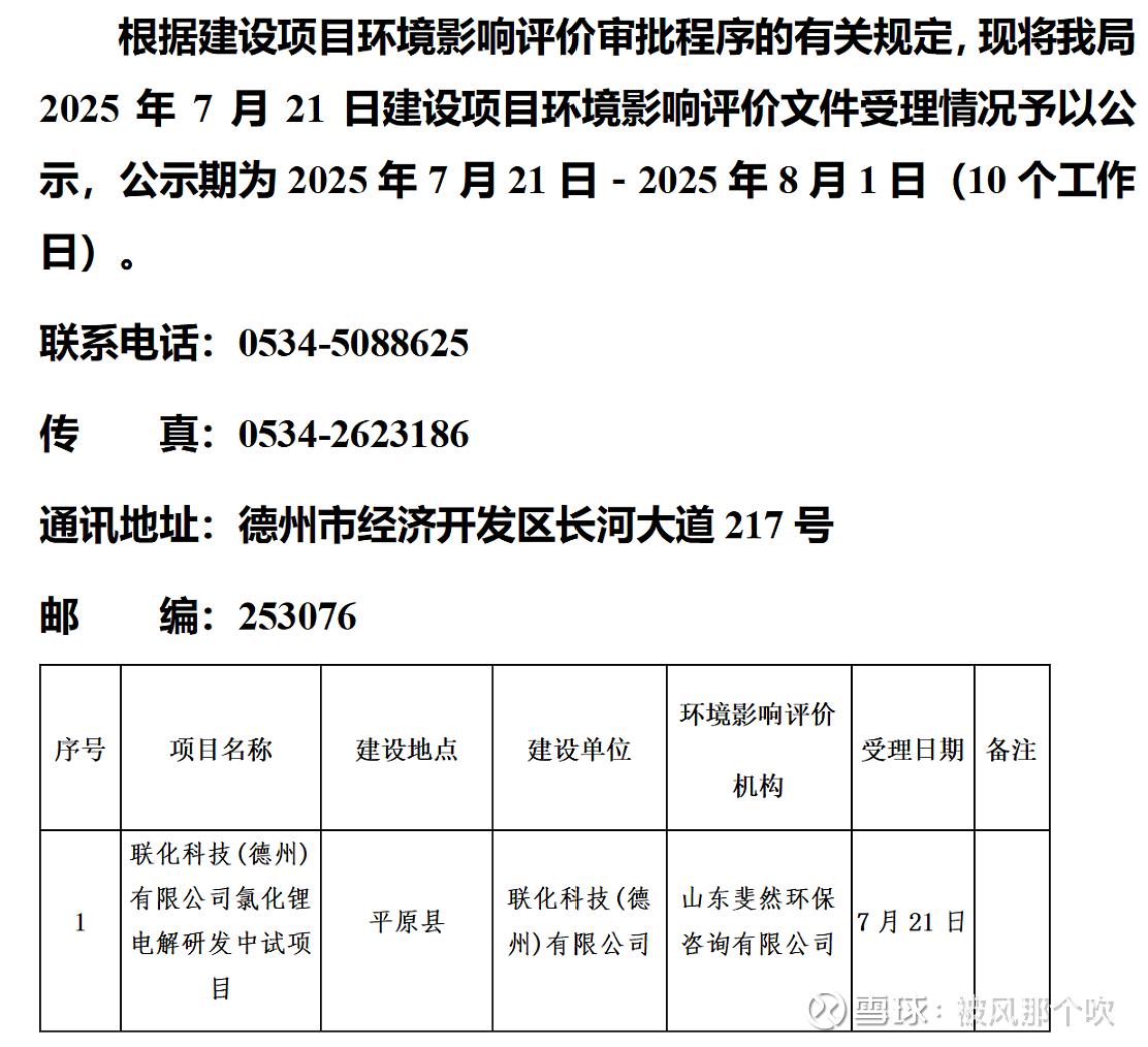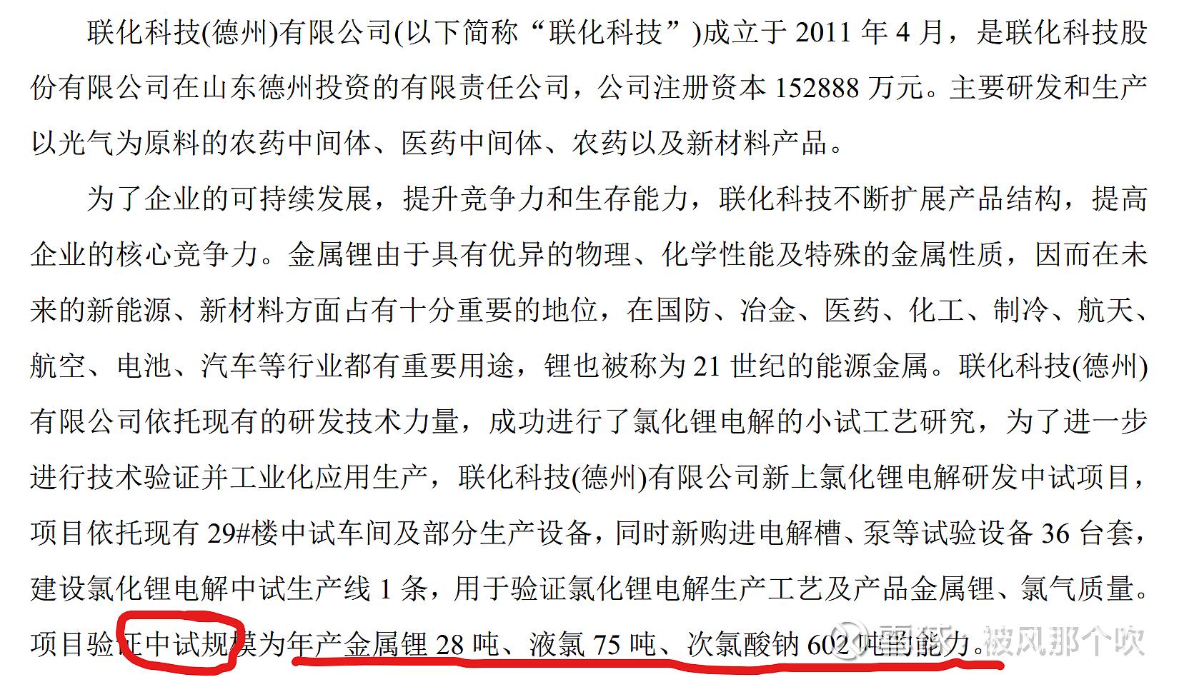 今年7月21日,德州市生态环境局发布关于联化科技(德州)有限公司氯化锂电解研发中试项目环境影响评价文件受理情况的公示。可以看出,联化已经成功进行小试,中试项目为建设氯化锂电解中试生产线 1 条,用于验证氯化锂电解生产工艺及产品金属锂、氯气质量。项目验证中试规模为年产金属锂 28 吨、液氯 75 吨、次氯酸钠 602 吨的能力。