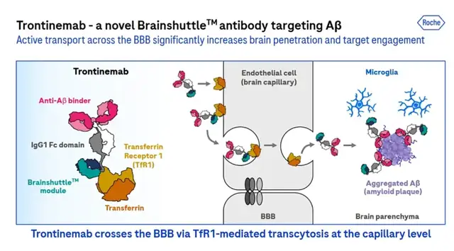 罗氏的Trontinemab利用“脑穿梭技术”,即将A抗体与转铁蛋白受体相结合的蛋白域融合,已经在轻中度AD患者的1b/2a期临床取得了不错的数据,在第12周时接受两种较高剂量(1.8 mg/kg与3.6 mg/kg)治疗的患者大脑淀粉样蛋白水平迅速且显著地降低,且在28周时大部分接受高剂量抗体治疗患者的大脑淀粉样蛋白斑块几乎全部清除。