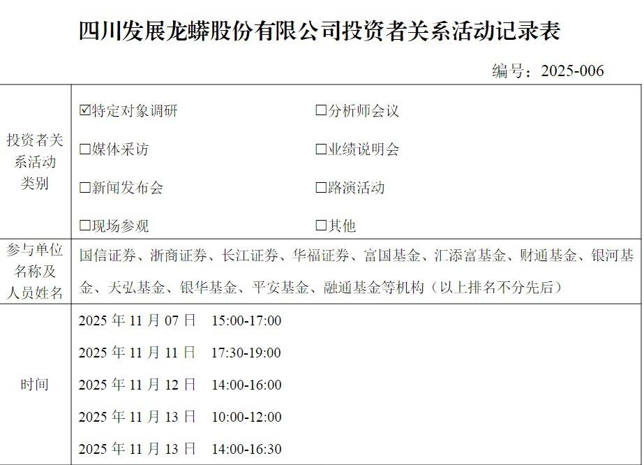 据公司公告披露,在11月7日、11日、12日、13日期间,包括国信证券、浙商证券、长江证券、华福证券、富国基金、汇添富基金、财通基金、银河基金、天弘基金、银华基金、平安基金、融通基金在内的多家机构对川发龙蟒进行了调研。
