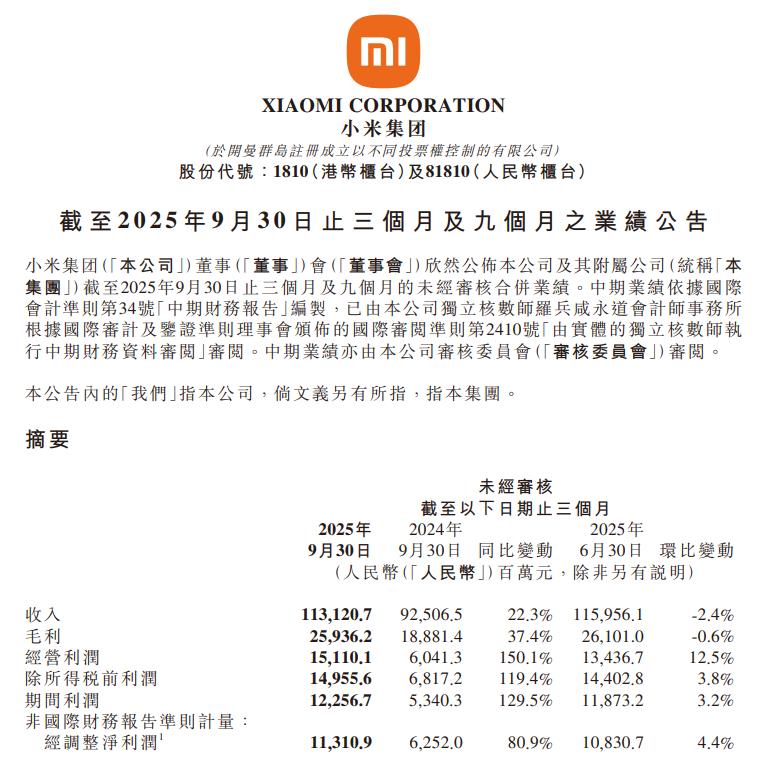 小米集团第三季度营收1,131.2亿元人民币,同比增长22.3%,预估1,125亿元人民币;经调整净利润为人民币113亿元,创历史新高,同比增长80.9%。业务分部来看,2025年第三季度,小米集团手机×AIoT分部收入为人民币841亿元,同比增长1.6%;小米集团的「智能电动汽车及AI等创新业务」分部收入为人民币290亿元,创历史新高,同比增长199.2%。小米集团毛利由2024年第三季度的人民币189亿元增加37.4%至2025年第三季度的人民币259亿元。毛利率由2024年第三季度的20.4%上升至2025年第三季度的22.9%。