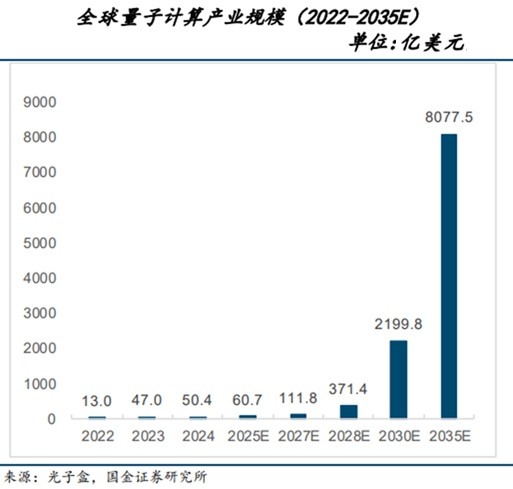 往后看,中国报告大厅网数据显示,我国量子科技市场规模预计到2029年将增至97.58亿美元。2024年至2029年复合年增长率预估为37.45%。国金证券的表示,预计到2030年,全球量子计算产业规模将达到2199.8亿美元,2035年达到8077.5亿美元。