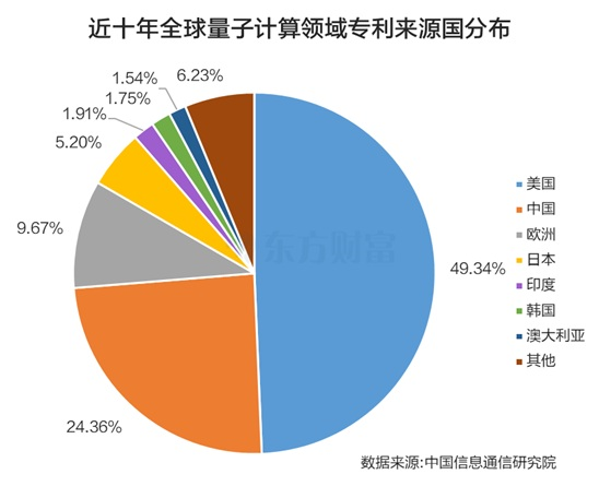 在中国信息通信研究院看来,在量子计算领域,目前已形成了中美引领的局面。截至2025年8月,全球量子计算企业超过400家,其中美国107家、中国42家,双双位居前列。再看过去十年全球量子计算领域专利技术来源国,其中美国占了49.34%,中国占了24.26%,欧洲以9.67%排在第三位。