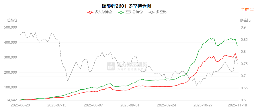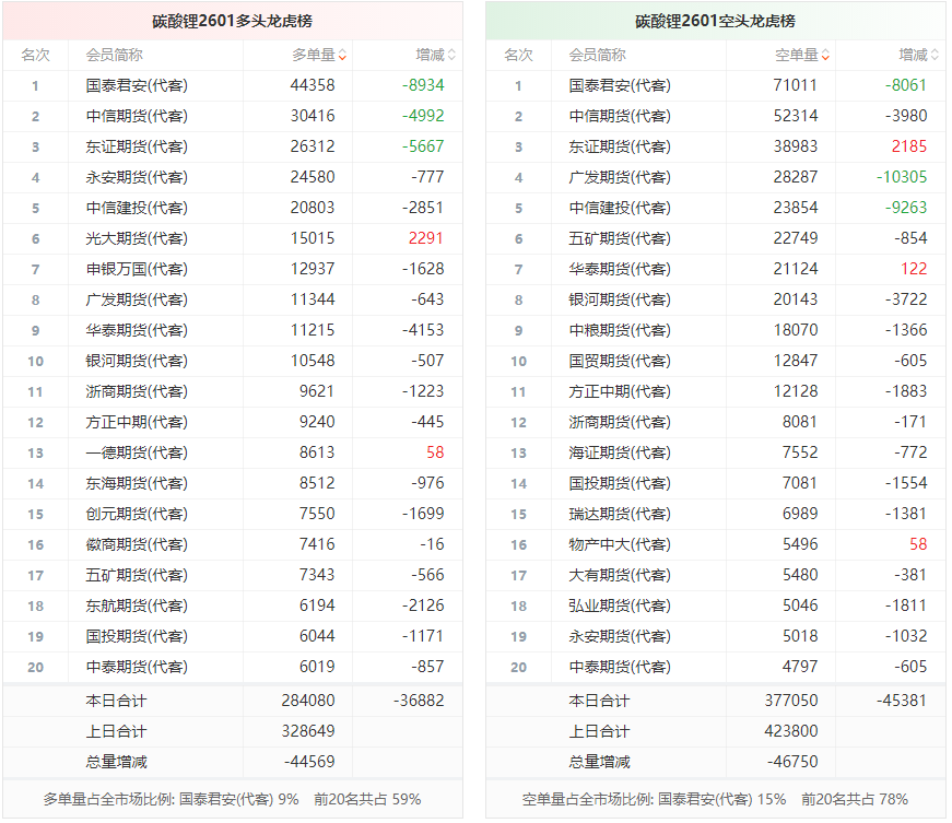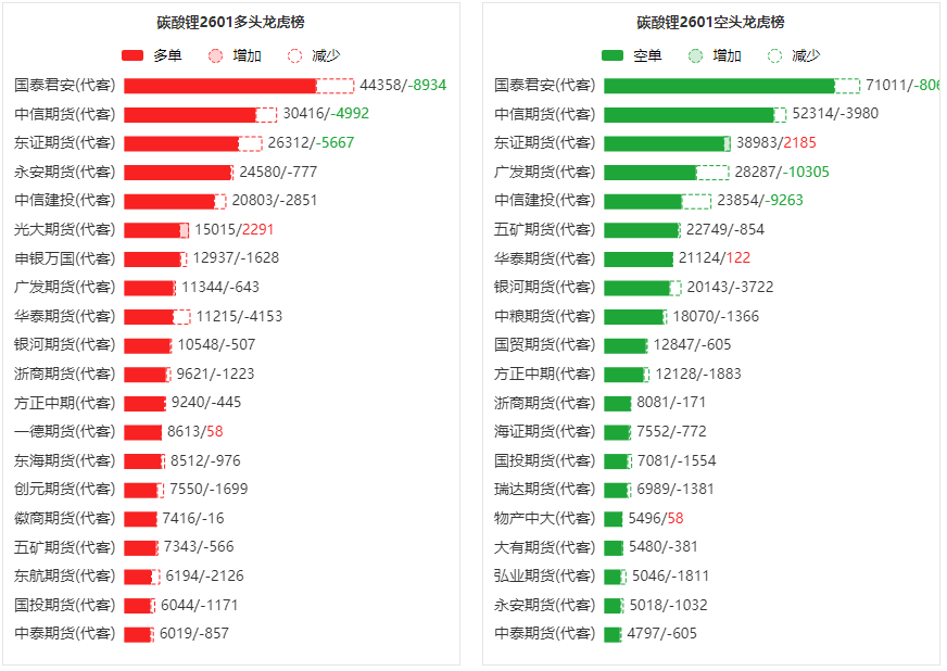 总体而言,碳酸锂2601合约今日减仓上行,多空持仓排名前20席中,多空双方均呈退场态势,多头退场意愿弱于空头。