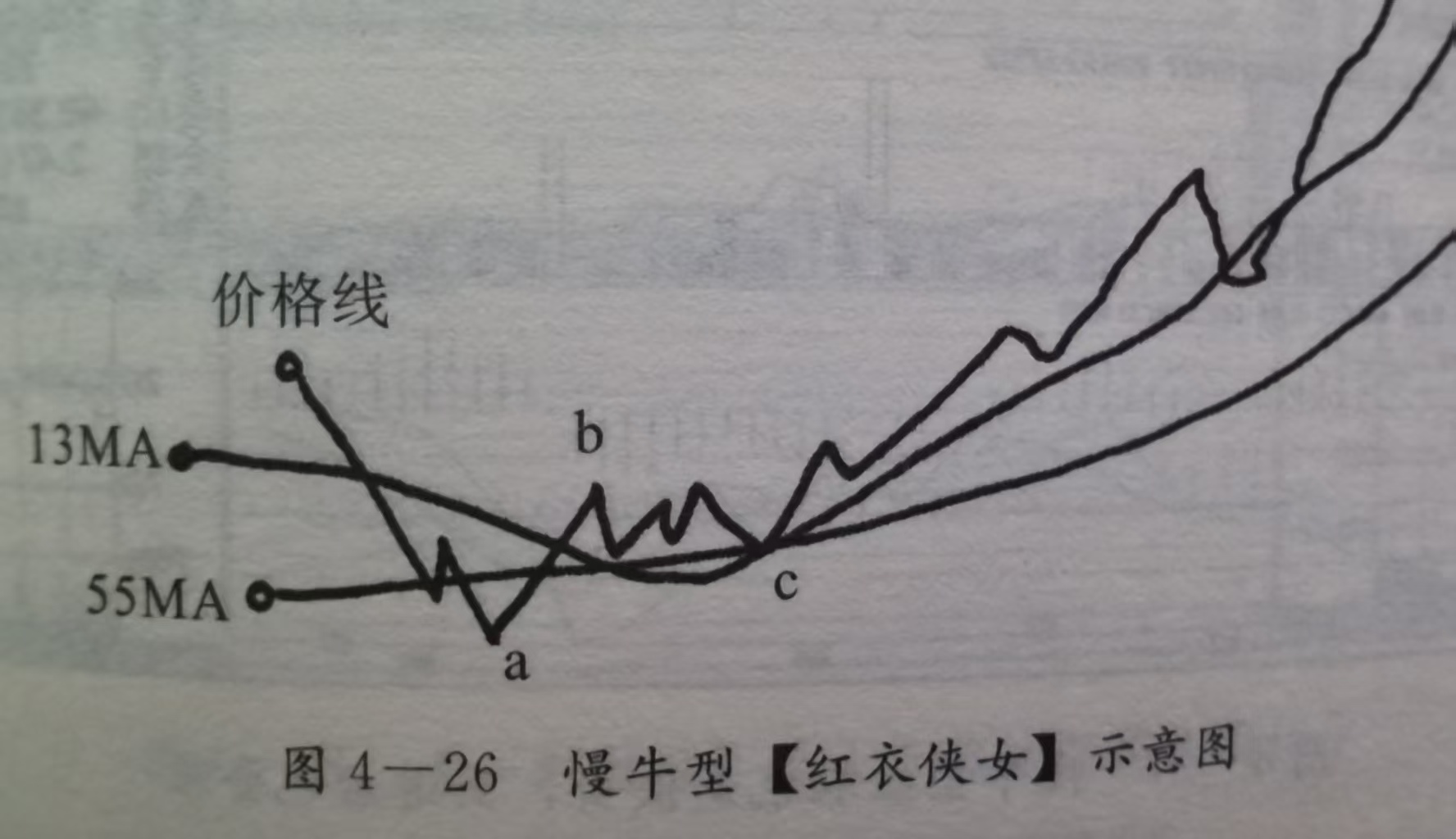 股价经过长时间的下跌或充分整理以后,在a点处获得支撑后开始发力上攻,但在前期压力位附近又顺势下滑,然后在c点处获得13日均线和55日均线双重支撑后再次上攻,股价走势呈锯齿状。红衣侠女出现以后,股价在均线上呈一定斜率慢牛攀升,当股价离13日均线较远时,主力就会停止拉升,开始震仓。当股价回落到13日均线附近时,主力再次将股价拉起,如此循环往复,股价在不知不觉中已上涨了许多。