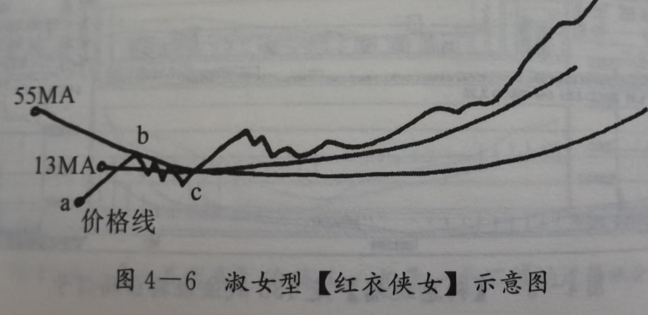 股价经过长期下跌或充分调整以后,13日均线由下跌趋于走平,表明股价有止跌企稳的迹象;温和放大的成交量以及起翘的13日均线,表明有增量资金进场收集,同时表明前期套牢盘此时已不再割肉,并且开始在低位补仓;股价虽未能有效上穿55日均线,但在55日均线附近进行窄幅整理,说明大部分筹码已被主力锁定;倘若主力继续打压,抛出的筹码很有可能收不回来,此时,主力的唯一选择就是拉升。“红衣侠女”分刚毅型、淑女型、相济型和慢牛型四种。
