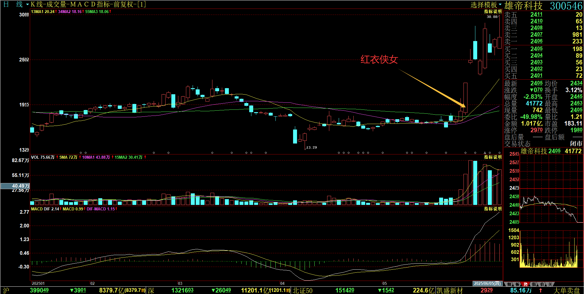红衣侠女是135战法中的经典攻击形态,复盘时只要发现该形态都应该引起足够的关注。因为它是股价质变的节点,在股价质变节点出现时,跟进获利速度比较快。若想把股票做好,无论买进还是卖出,都要讲究“进退有据”,不要去赌,也不要去猜,严格按指令操作。