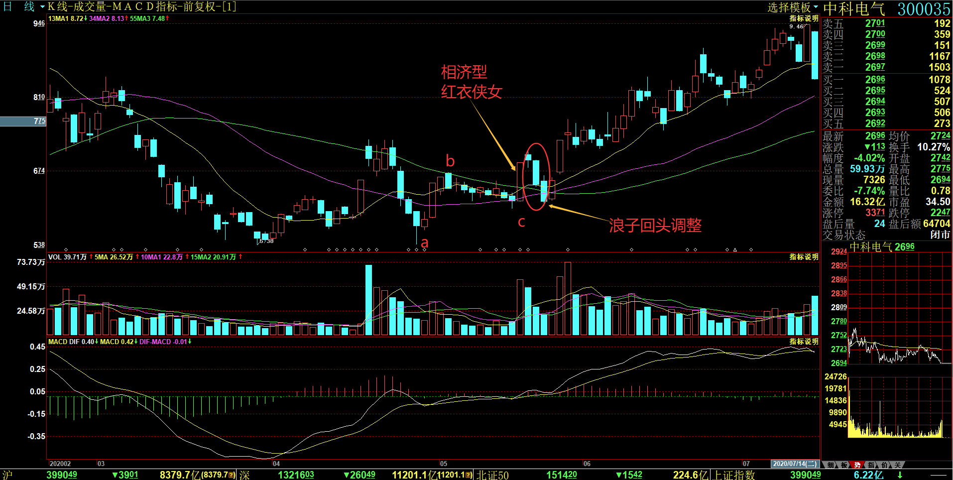 6、中科电气(300035)同样的形态每天都在大量的重复出现,2020年5月20号,该股“红衣侠女”出现,由于55线还未走平,股价用“浪子回头”又重新考验了一下支撑,之后又是来了个几日横盘,“三剑客”确认直至“落井下石”和“过河折桥”。