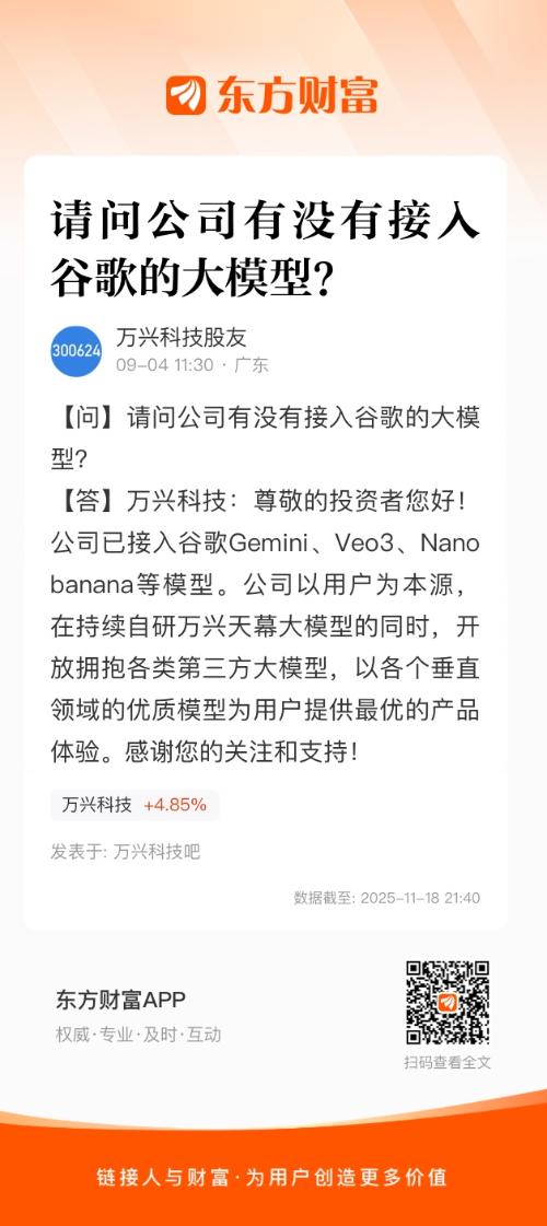 尊敬的投资者您好!公司已接入谷歌Gemini、Veo3、Nano banana等模型。公司以用户为本源,在持续自研万兴天幕大模型的同时,开放拥抱各类第三方大模型,以各个垂直领域的优质模型为用户提供最优的产品体验。感谢您的关注和支持!