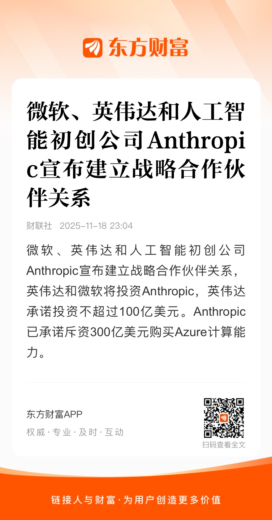 微软、英伟达和人工智能初创公司Anthropic宣布建立战略合作伙伴关系,英伟达和微软将投资Anthropic,英伟达承诺投资不超过100亿美元,微软承诺向Anthropi投资至多50亿美元。Anthropic承诺购买300亿美元的Azure计算容量,并计划将额外计算容量扩展至最高1吉瓦。此次合作将使Claude成为全球三大云服务中唯一可用的前沿大型语言模型。Azure用户将获得更广泛的型号选择和Claude专属的新功能访问权限。