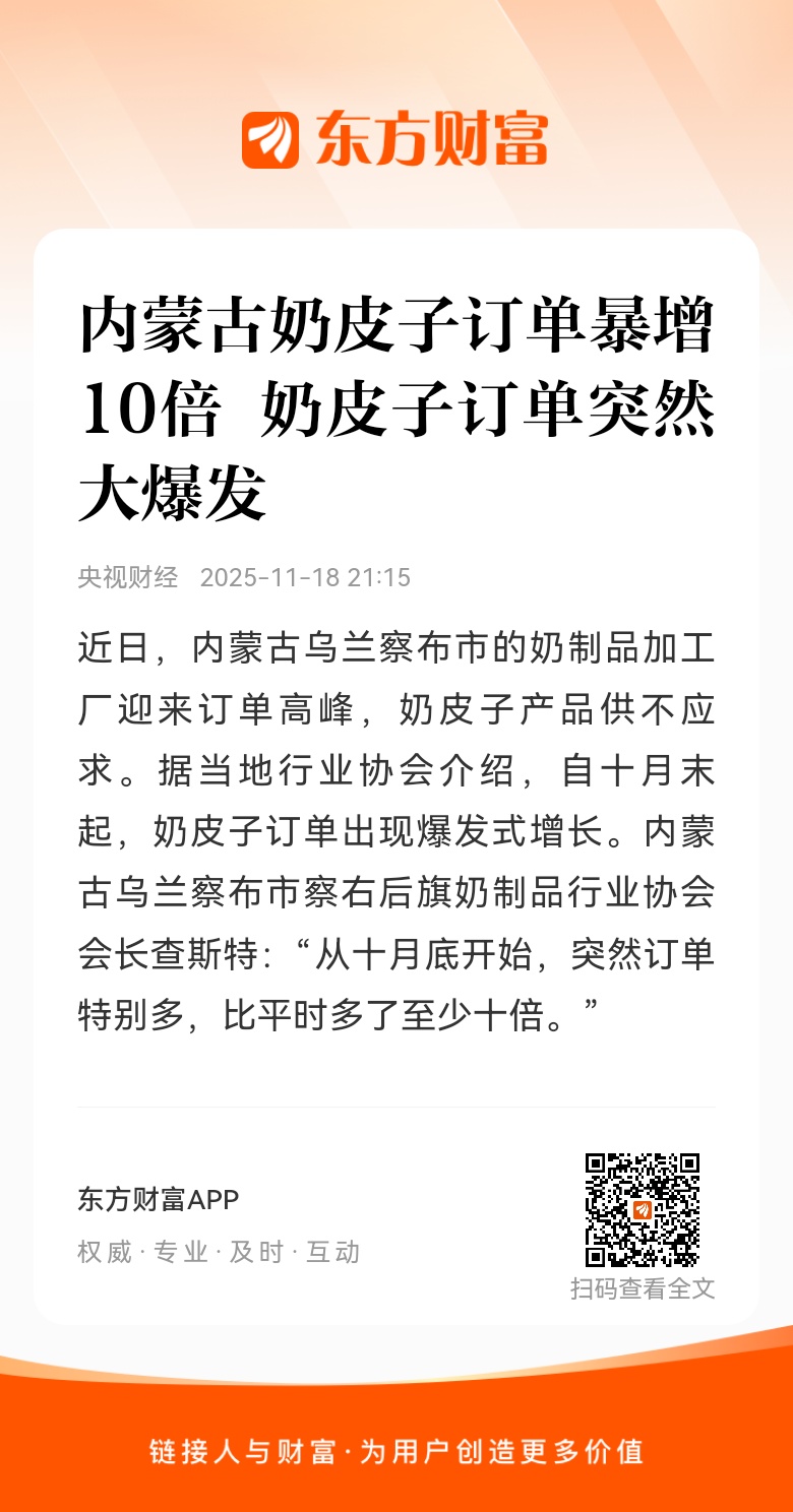 据当地行业协会介绍,自十月末起,奶皮子订单出现爆发式增长。内蒙古乌兰察布市察右后旗奶制品行业协会会长查斯特:“从十月底开始,突然订单特别多,比平时多了至少十倍。”