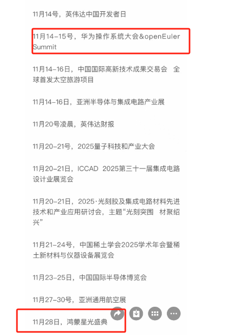 科技线里的华为概念在下午也有所异动,本月催化很多,可以关注一下。根据知名数码博主的爆料,华为Mate80系列可能会在11月25日正式发布,和之前传闻的时间差不多,都是在11月中下旬。拿上一代华为Mate70系列来说,就是在11月26日周二发布,而且今年11月25日刚好也是周二(华为习惯性会在周二发布新品)。另外在11月28日,央视还会举办鸿蒙盛典,华为Mate80系列会可能和鸿蒙盛典同一周。