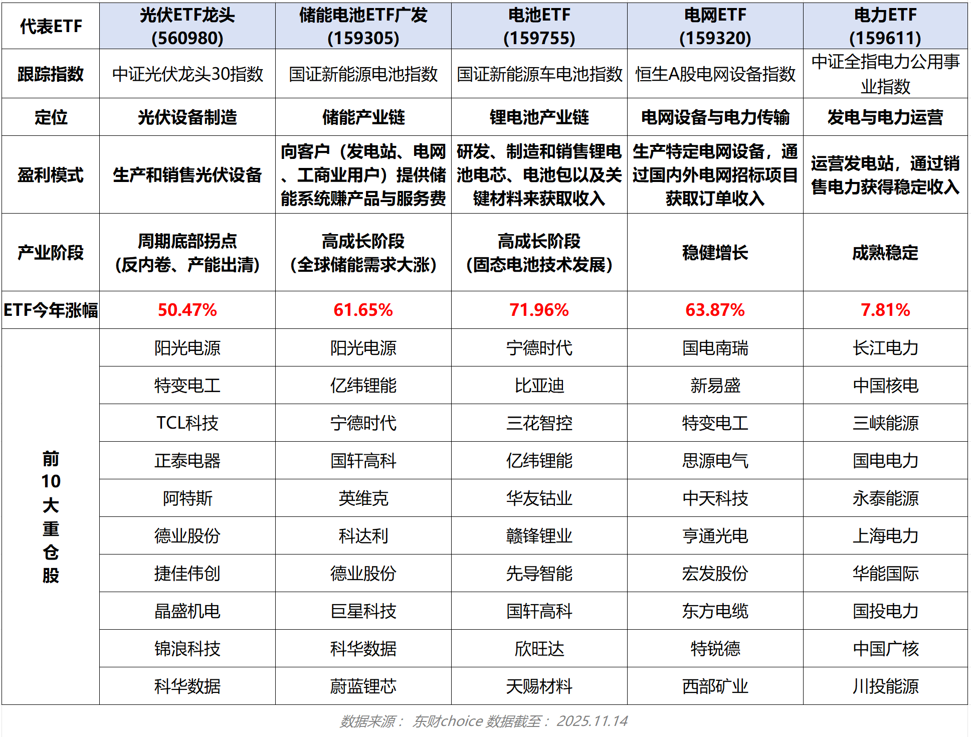 1、首先,表格中的5大标的都与“电”息息相关,但各自分工明确:有发电的光伏龙头指数,有运输电的电网设备指数,有存储电的储能电池和电池指数,有运营电的电力公用事业指数。