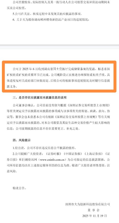南财智讯11月19日电,大为股份公告,公司股票于2025年11月18日、2025年11月19日连续两个交易日收盘价格涨幅偏离值累计达到22.53%。根据深圳证券交易所相关规定,属于股票交易异常波动情况。针对该异常波动,公司对相关事项进行了核实,并问询了管理层、控股股东、实际控制人及其一致行动人。经核查,公司前期披露的信息不存在需要更正或补充之处;近期未发现公共媒体报道可能对公司股价产生较大影响的未公开重大信息;生产经营情况正常,内外部经营环境未发生重大变化。公司控股股东、实际控制人及其一致行动人确认不存在应披露而未披露的重大事项,且在股票交易异常波动期间未买卖公司股票。此外,关于湖南郴州锂电新能源产业项目,公司已收到湖南省国土资源厅完成储量备案的复函,探矿权转采矿权的重要环节已完成,目前正推进相关手续办理,具体进度视政府部门审批情况而定。公司董事会确认,目前没有任何应予披露而未披露的事项,也未获悉可能对公司股票交易价格产生较大影响的信息。