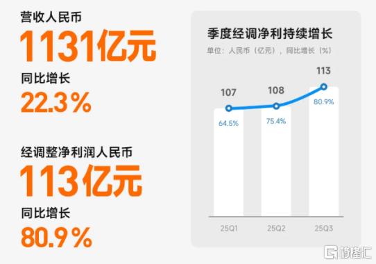 据公告所示,截至9月30日前三月(即2025年三季度),小米集团录得营收1131亿元人民币(单位下同),同比增长22.3%;期间利润123亿元,同比大增129.5%;经调整归母净利润达113亿元,同比增长80.9%。从数据来看,小米三季度业绩依然表现亮眼。