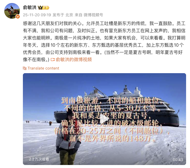11月20日上午,新东方董事长俞敏洪在社交平台发文,回应其在南极旅游发全员信引发的争议。俞敏洪表示,“允许员工吐槽是新东方的传统,我一直鼓励。员工有不满,我和公司有问题,及时纠正。也有冒充新东方员工在网上发声的,我相信大家也能明辨。南极是一片纯净的土地,如果大家有机会,可以来看看。我打算明年冬天,选择10个左右的新东方、东方甄选的基层优秀员工,加上东方甄选10个优秀会员,由公司支持到南极来看一看。”