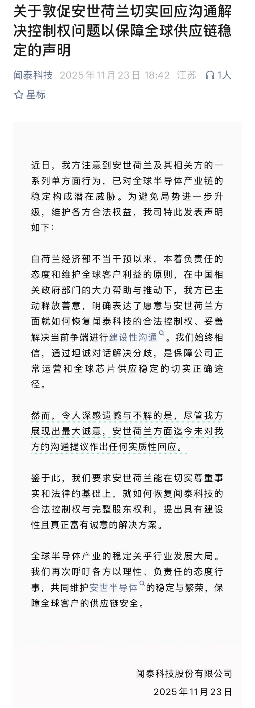 自荷兰经济部不当干预以来,本着负责任的态度和维护全球客户利益的原则,在中国相关政府部门的大力帮助与推动下,我方已主动释放善意,明确表达了愿意与安世荷兰方面就如何恢复闻泰科技的合法控制权、妥善解决当前争端进行建设性沟通。我们始终相信,通过坦诚对话解决分歧,是保障公司正常运营和全球芯片供应稳定的切实正确途径。