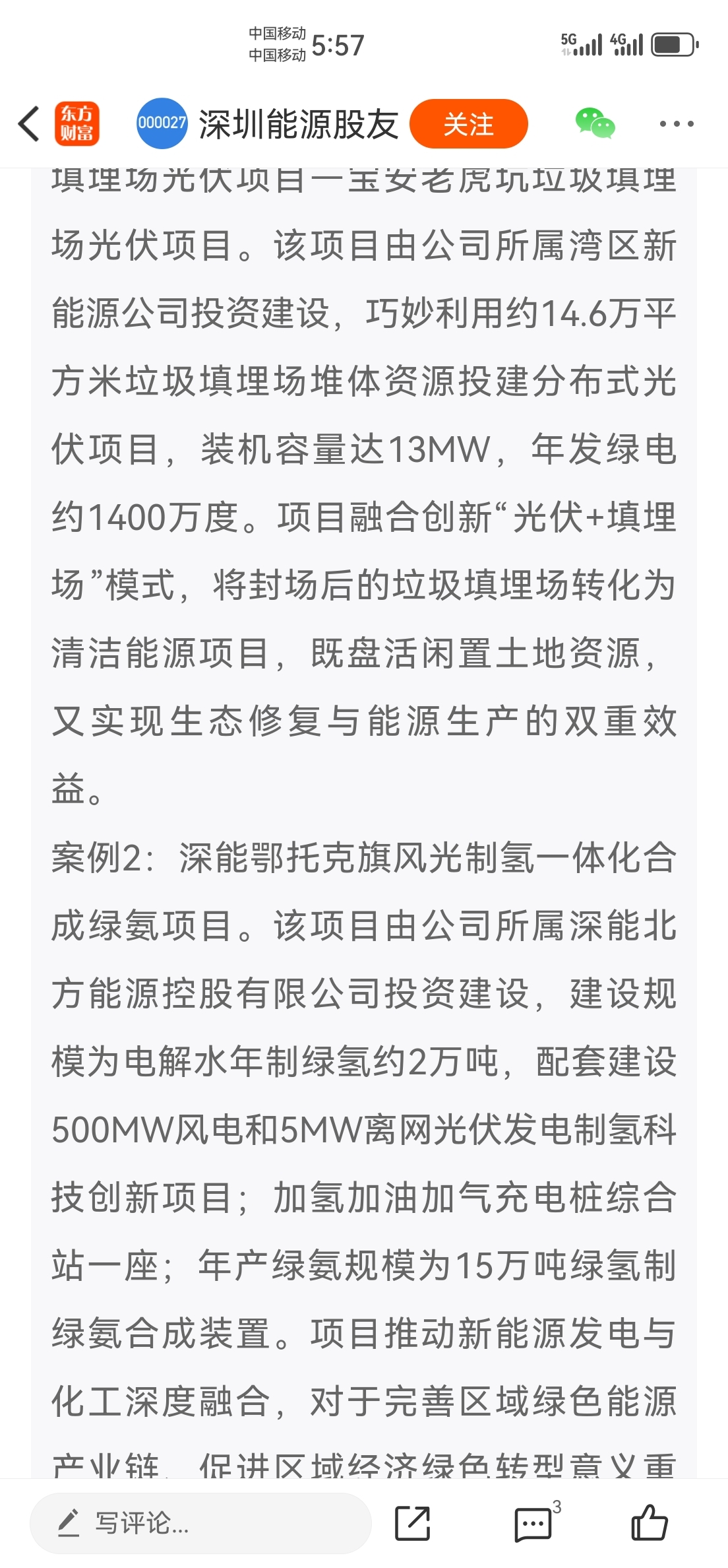 问深证能源的新能源业务有没有契合融合发展理念?有没有成功案例?答您好,公司新能源业务契合融合发展理念的案例主要有:案例1:全国规模最大、广东省首个垃圾填埋场光伏项目—宝安老虎坑垃圾填埋场光伏项目。该项目由公司所属湾区新能源公司投资建设,巧妙利用约14.6万平方米垃圾填埋场堆体资源投建分布式光伏项目,装机容量达13MW,年发绿电约1400万度。项目融合创新“光伏+填埋场”模式,将封场后的垃圾填埋场转化为清洁能源项目,既盘活闲置土地资源,又实现生态修复与能源生产的双重效益。案例2:深能鄂托克旗风光制氢一体化合成绿氨项目。该项目由公司所属深能北方能源控股有限公司投资建设,建设规模为电解水年制绿氢约2万吨,配套建设500MW风电和5MW离网光伏发电制氢科技创新项目;加氢加油加气充电桩综合站一座;年产绿氨规模为15万吨绿氢制绿氨合成装置。项目推动新能源发电与化工深度融合,对于完善区域绿色能源产业链、促进区域经济绿色转型意义重大。来自深交所互动易答复时间2025-11-24