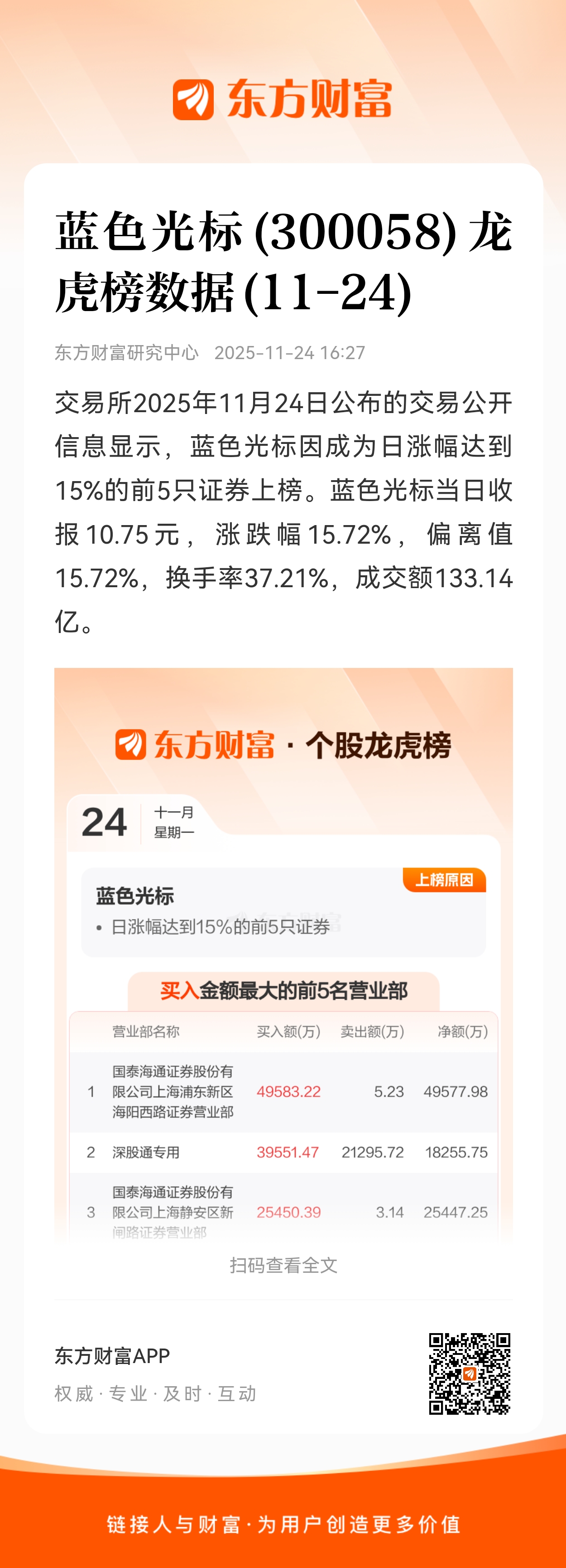 交易所2025年11月24日公布的交易公开信息显示,蓝色光标因成为日涨幅达到15%的前5只证券上榜。蓝色光标当日收报10.75元,涨跌幅15.72%,偏离值15.72%,换手率37.21%,成交额133.14亿。