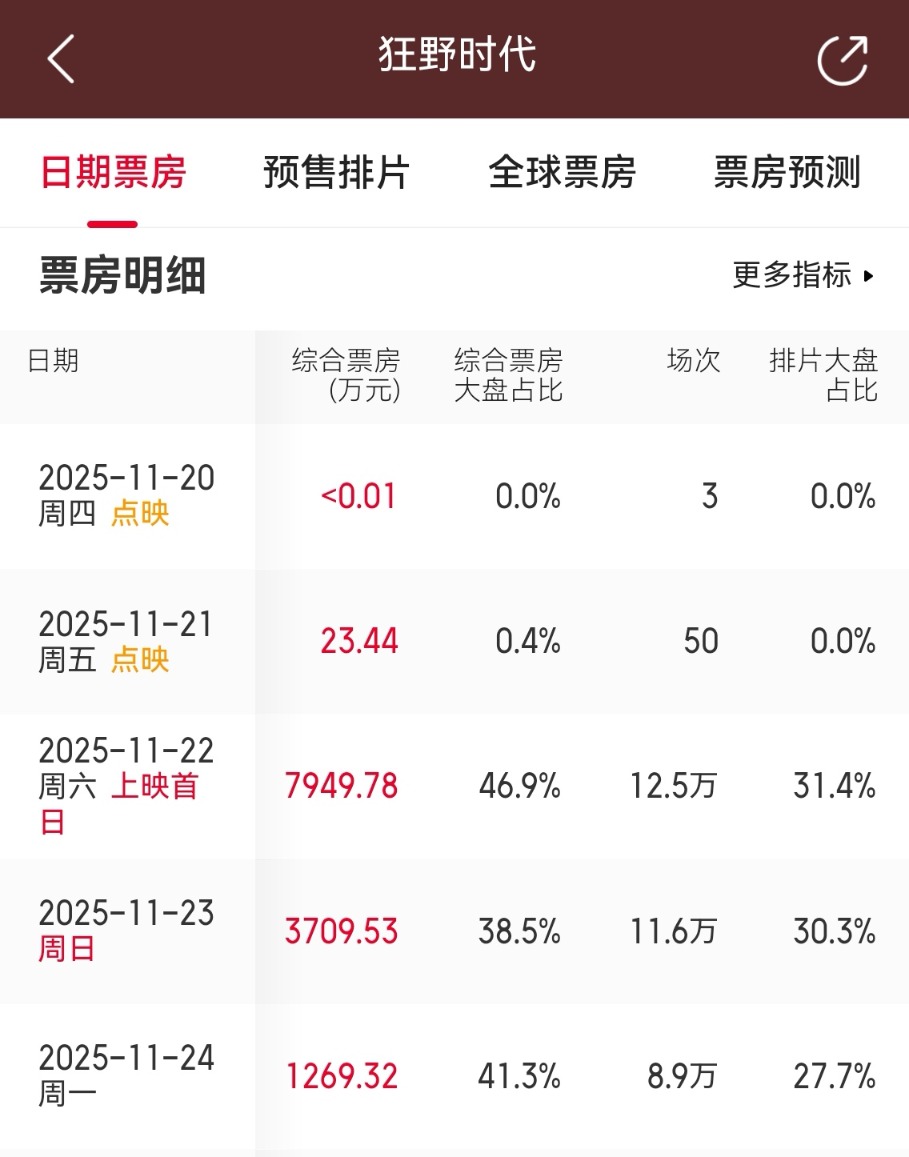 值得关注的是,该影片上市首日的退票率在个别平台上已接近15%。据猫眼专业版,《狂野时代》上映首日(即11月22日),大盘退票人次达25.6万,大盘退票率达10.5%;猫眼退票人次达15.4万,猫眼退票率达14.8%。退票率和同期部分热门影片相比,略偏高。此外,11月22日、23日该影片的网售票房占比分别为75.4%、57.6%,较同期热门影片偏低。