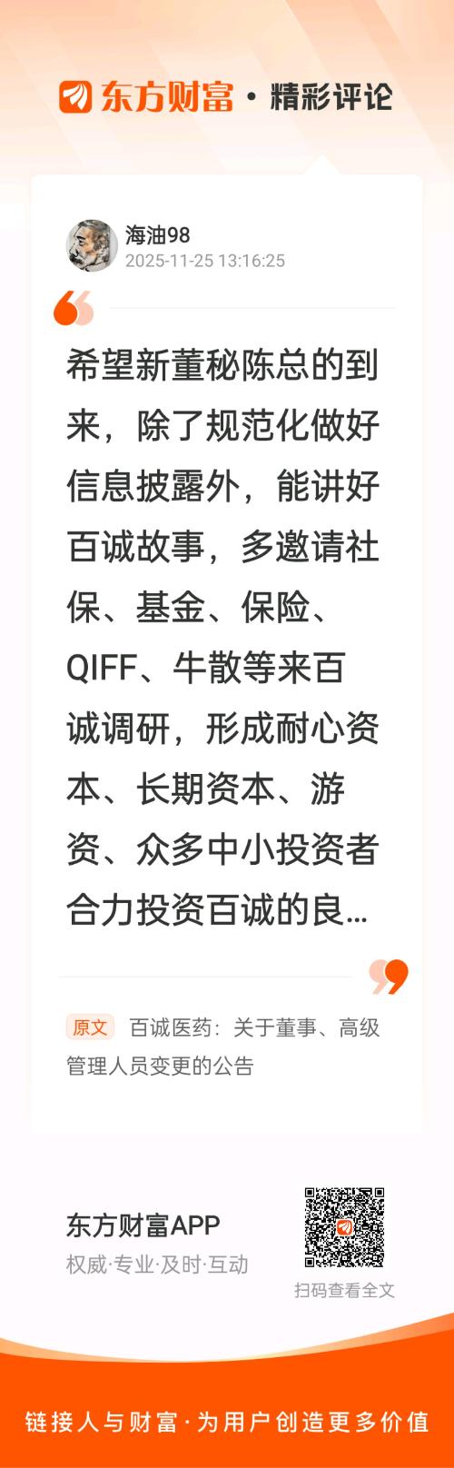 换人如换刀//@海油98 :希望新董秘陈总的到来,除了规范化做好信息披露外,能讲好百诚故事,多邀请社保、基金、保险、QIFF、牛散等来百诚调研,形成耐心资本、长期资本、游资、众多中小投资者合力投资百诚的良性投资者结构,共同培育杭州七小龙。