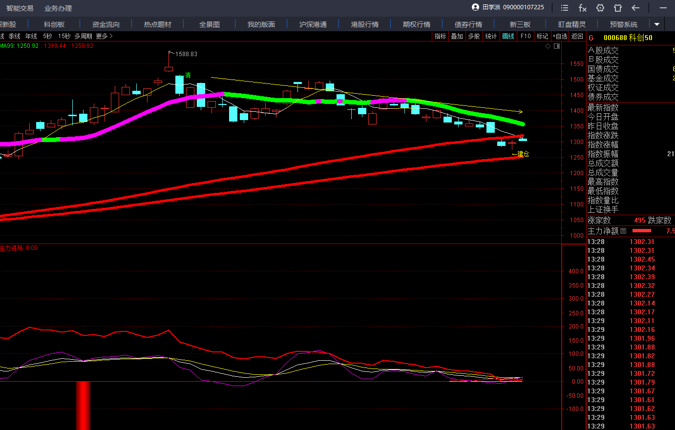 科创50指数今天跳空上涨1个点,上一次我说过跌至77均线附近止跌,现在跌至77均线附近了但是从日线图形看,13均线倾斜往下,这里智慧反抽13均线然后继续在这里磨底,因为13均线往下还没有走平,如此反复反抽13均线等13均线走平,然后才开启主升浪行情,同时现在周线macd死叉,周kdj也未金叉,不支持科创50指数上涨。