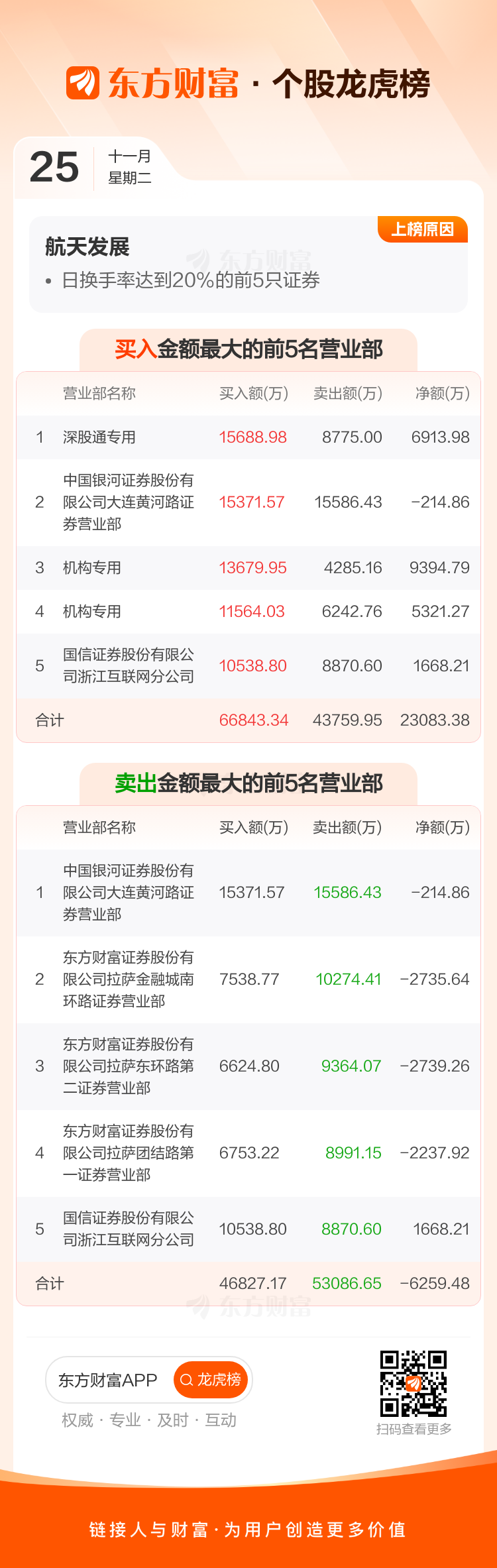 交易所2025年11月25日公布的交易公开信息显示,航天发展因成为日换手率达到20%的前5只证券上榜。航天发展当日收报14.1元,涨跌幅3.37%,偏离值38.73%,换手率38.73%,成交额86.26亿。