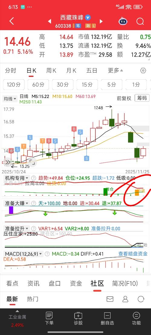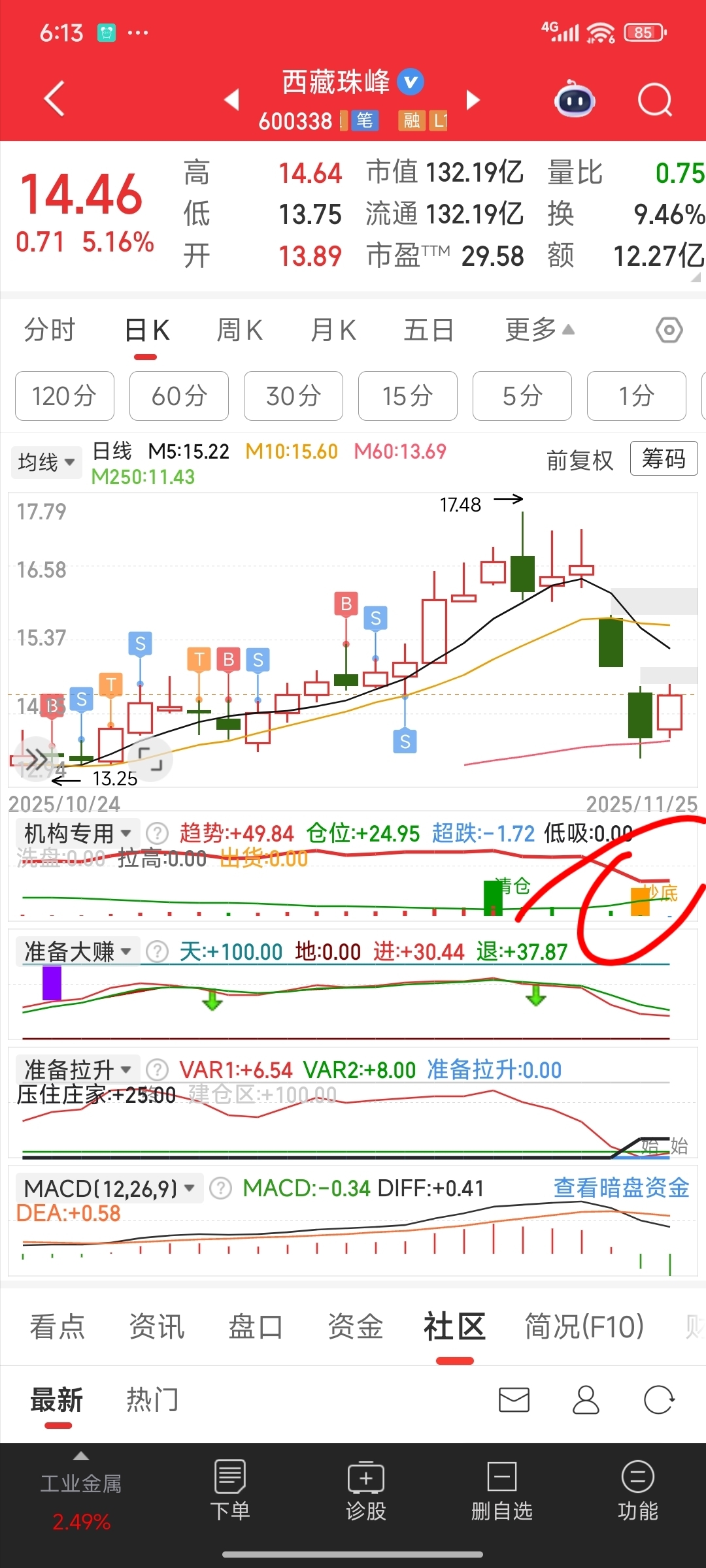 锂矿出现抄底信号,做波段拿到它出现清仓信号。 //@Norton139 :珠峰,看支撑位14.45,企稳就继续赶路。慢牛走走停停,很正常,向上趋势不变。