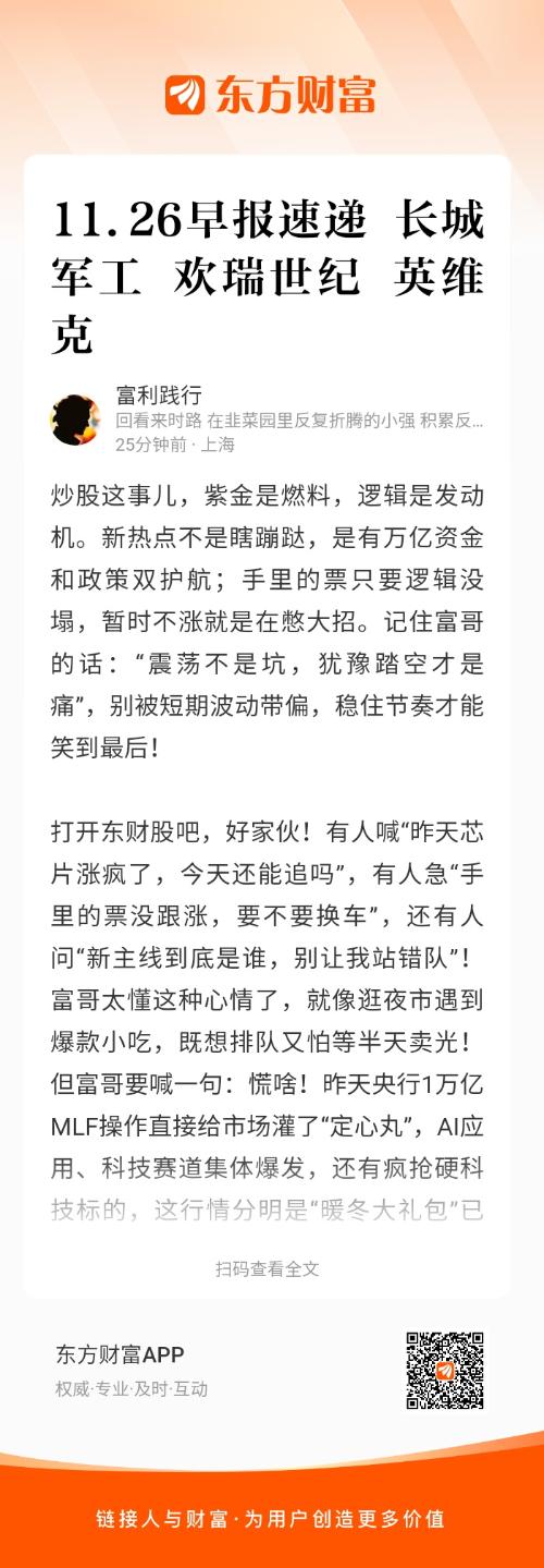 打开东财股吧,好家伙!有人喊“昨天芯片涨疯了,今天还能追吗”,有人急“手里的票没跟涨,要不要换车”,还有人问“新主线到底是谁,别让我站错队”!富哥太懂这种心情了,就像逛夜市遇到爆款小吃,既想排队又怕等半天卖光!但富哥要喊一句:慌啥!昨天央行1万亿MLF操作直接给市场灌了“定心丸”,AI应用、科技赛道集体爆发,还有疯抢硬科技标的,这行情分明是“暖冬大礼包”已到位!现在不是没机会,是好机会扎堆来,抓对了就是大口!