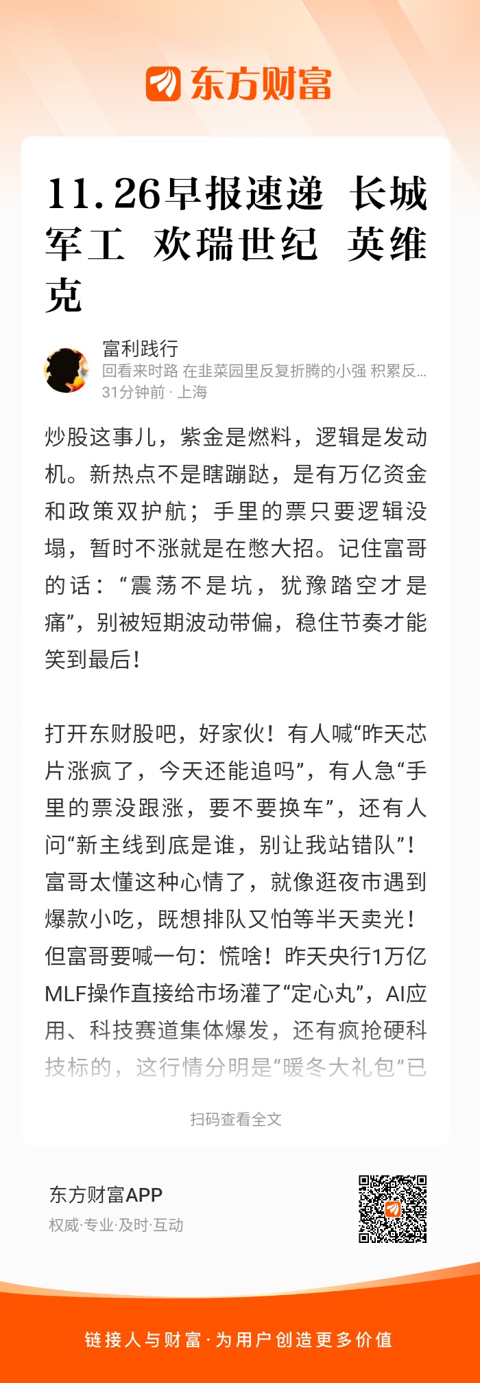 打开东财股吧,好家伙!有人喊“昨天芯片涨疯了,今天还能追吗”,有人急“手里的票没跟涨,要不要换车”,还有人问“新主线到底是谁,别让我站错队”!富哥太懂这种心情了,就像逛夜市遇到爆款小吃,既想排队又怕等半天卖光!但富哥要喊一句:慌啥!昨天央行1万亿MLF操作直接给市场灌了“定心丸”,AI应用、科技赛道集体爆发,还有疯抢硬科技标的,这行情分明是“暖冬大礼包”已到位!现在不是没机会,是好机会扎堆来,抓对了就是大口!