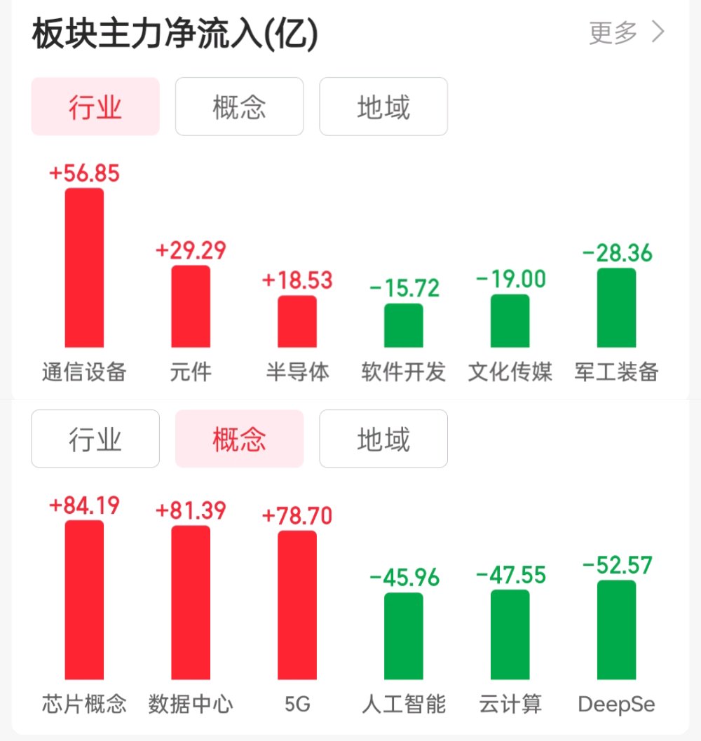 昨日 A 股板块轮动节奏加快,持续性偏弱,多数热点呈现 “一日游” 特征:F5G 概念、游戏、通信设备、共封装光学、光纤概念、贵金属等板块涨幅居前,而资金流向出现明显分化 —— 芯片概念、数据中心、5G、通信设备、元件等板块获资金净流入,Deepseek、云计算、人工智能、军工装备、文化传媒等板块则遭遇资金流出。板块整体情绪偏谨慎背景下,流感药相关订单飙涨 14 倍,流感概念股已获资金提前抢筹,市场或迎来一轮阶段性炒作窗口。