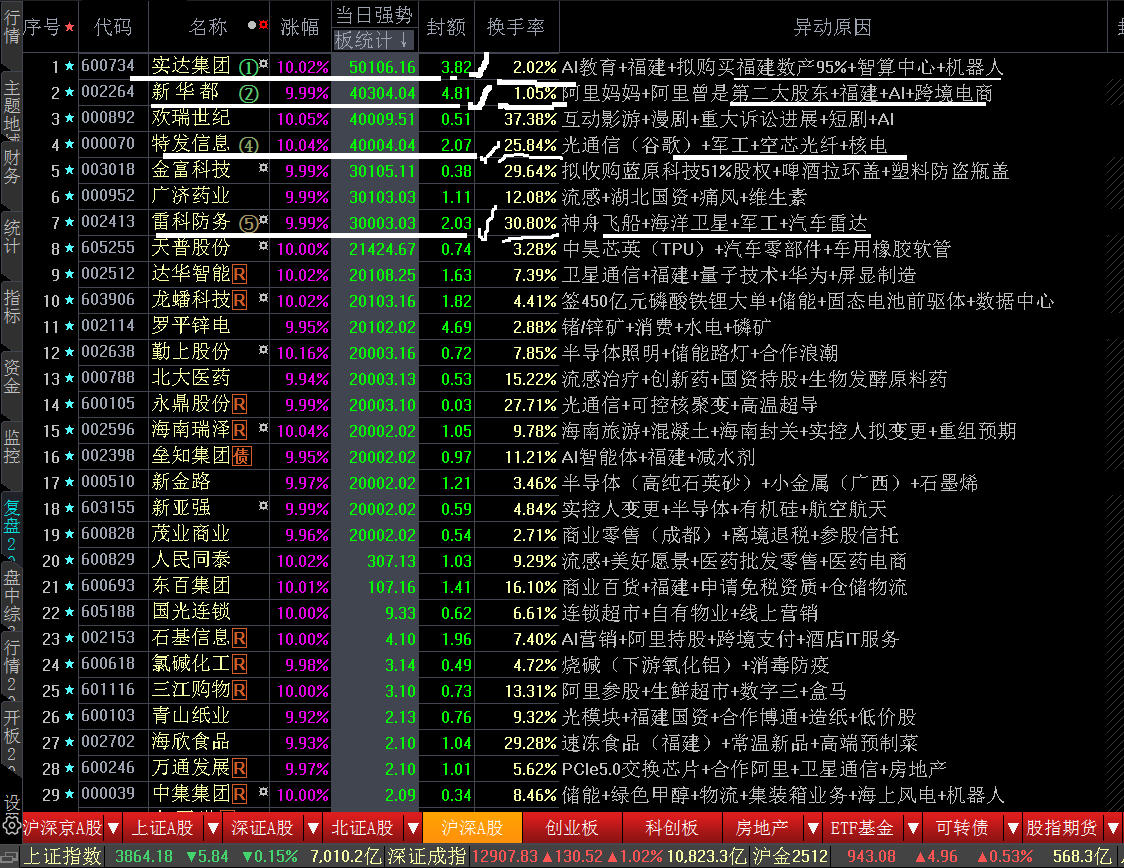 明天可重点关注实达集团600734和新华者002264(具体哪些股值得介入还要看明天的竞价盘口数据),特发信息000070和雷科防务002413的换手率有点大,明天要注意风险,如果盘口不强最好及时获利了结。以下是今天的涨停股复盘截图: