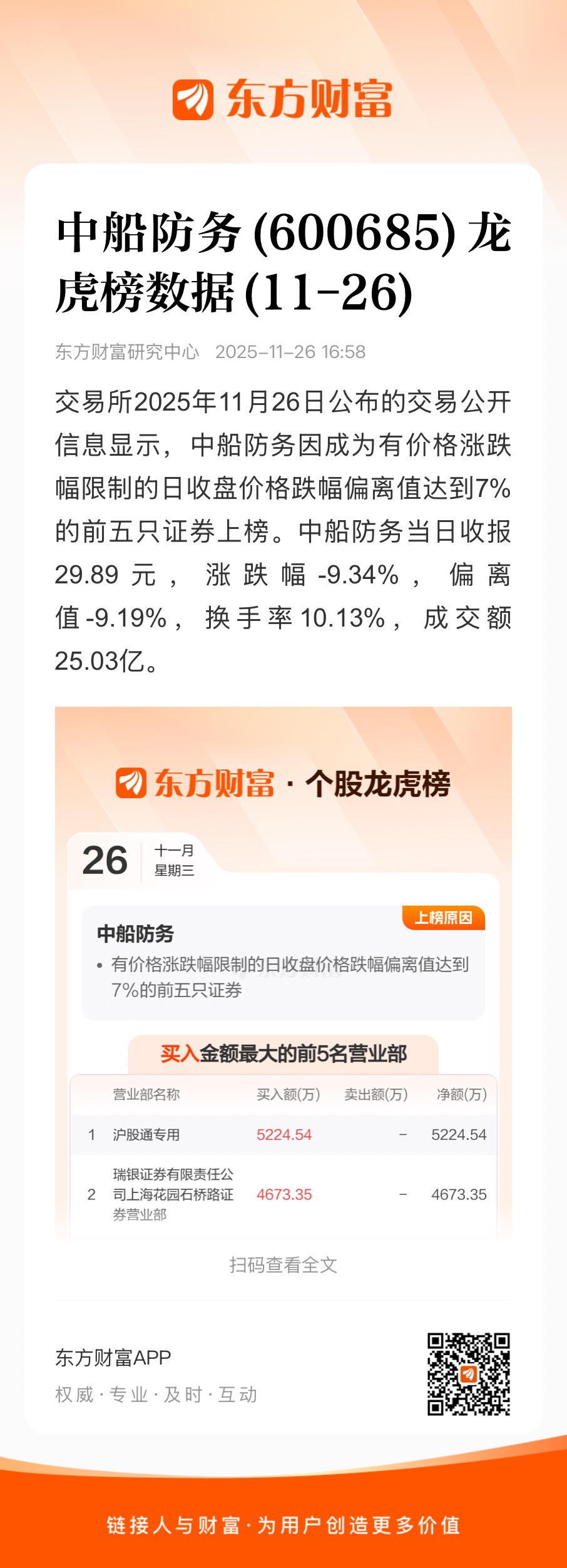 交易所2025年11月26日公布的交易公开信息显示,中船防务因成为有价格涨跌幅限制的日收盘价格跌幅偏离值达到7%的前五只证券上榜。中船防务当日收报29.89元,涨跌幅-9.34%,偏离值-9.19%,换手率10.13%,成交额25.03亿。