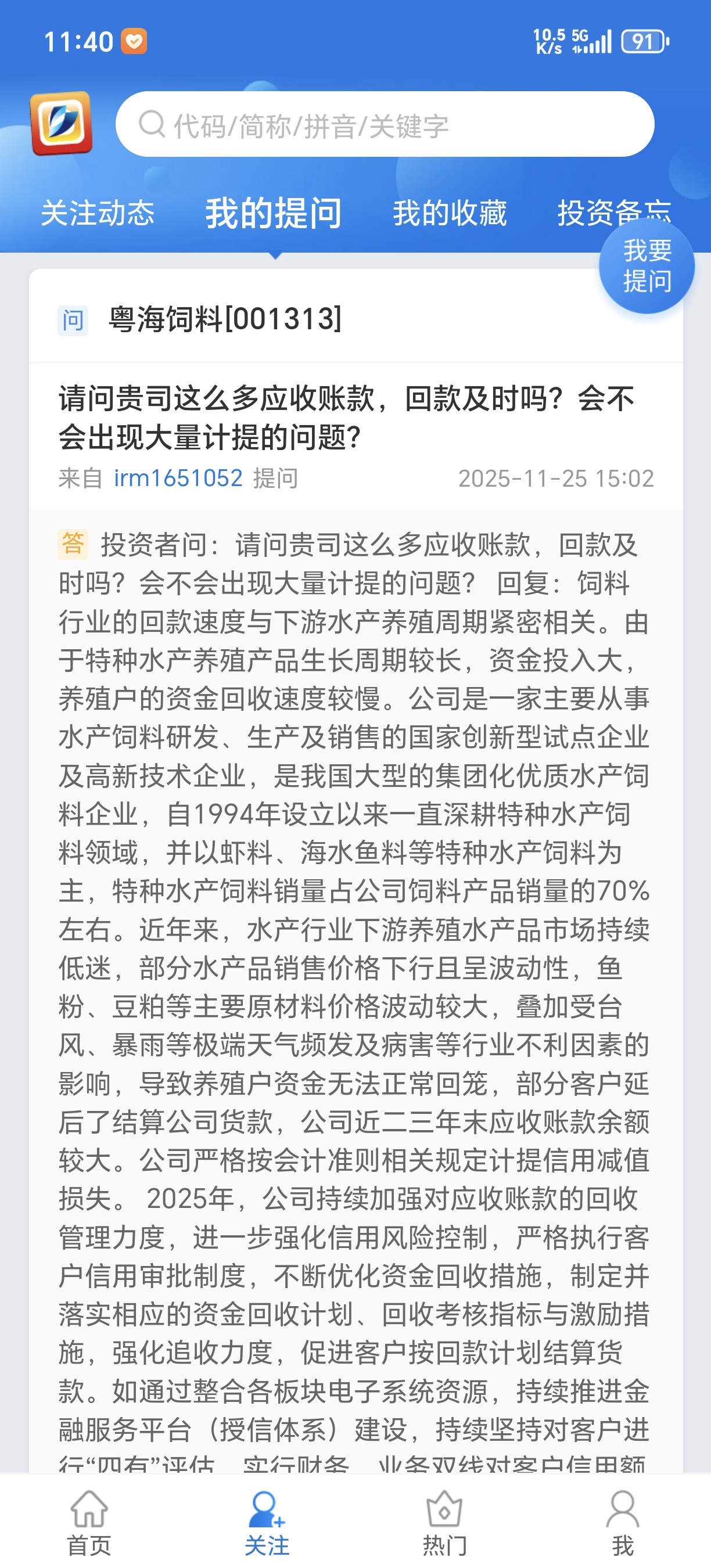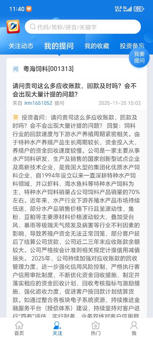 回复:饲料行业的回款速度与下游水产养殖周期紧密相关。由于特种水产养殖产品生长周期较长,资金投入大,养殖户的资金回收速度较慢。公司是一家主要从事水产饲料研发、生产及销售的国家创新型试点企业及高新技术企业,是我国大型的集团化优质水产饲料企业,自1994年设立以来一直深耕特种水产饲料领域,并以虾料、海水鱼料等特种水产饲料为主,特种水产饲料销量占公司饲料产品销量的70%左右。近年来,水产行业下游养殖水产品市场持续低迷,部分水产品销售价格下行且呈波动性,鱼粉、豆粕等主要原材料价格波动较大,叠加受台风、暴雨等极端天气频发及病害等行业不利因素的影响,导致养殖户资金无法正常回笼,部分客户延后了结算公司货款,公司近二三年末应收账款余额较大。公司严格按会计准则相关规定计提信用减值损失。