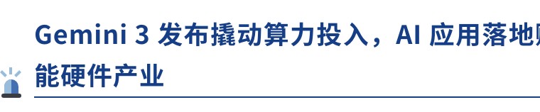 谷歌发布的 Gemini 3 在推理能力、多模态理解及智能体编程等方面实现升级,推动 AI 应用场景持续拓展。而 AI 应用的大规模落地将进一步撬动算力基础设施投入,数据中心建设加速直接带动光连接器、光模块、有源光缆等硬件产品需求增长,相关供应商将享受产业红利。