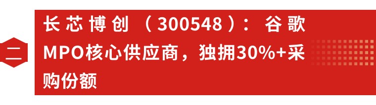 长芯博创是A 股中唯一向谷歌供应 MPO 光纤连接器的核心企业,通过控股子公司长芯盛(持股 60.45%)成为谷歌 AOC、MPO 等光互联部件的核心供应商,其 MPO产品在谷歌全球采购中占比达30%+,为A股该领域份额第一的标的。在谷歌算力投资正循环的产业链中,公司是MPO细分环节里A股独有的核心供应主体,卡位优势显著。