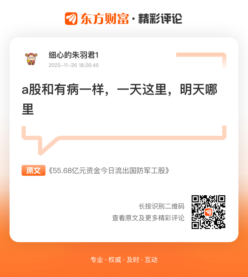 a股和有病一样,一天这里,明天哪里 我在《55.68亿元资金今日流出国防军工股》的评论获得了大家的关注。