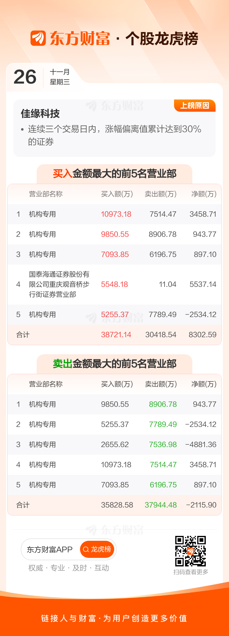 交易所2025年11月26日公布的交易公开信息显示,佳缘科技因成为日换手率达到30%的前5只证券、连续三个交易日内,涨幅偏离值累计达到30%的证券上榜。佳缘科技当日收报51.05元,涨跌幅5.98%,偏离值50.17%,换手率50.17%,成交额21.35亿。异常期间11月24日至11月26日,期间涨幅34.87%,累计偏离值31.11%,区间成交额40.97亿。