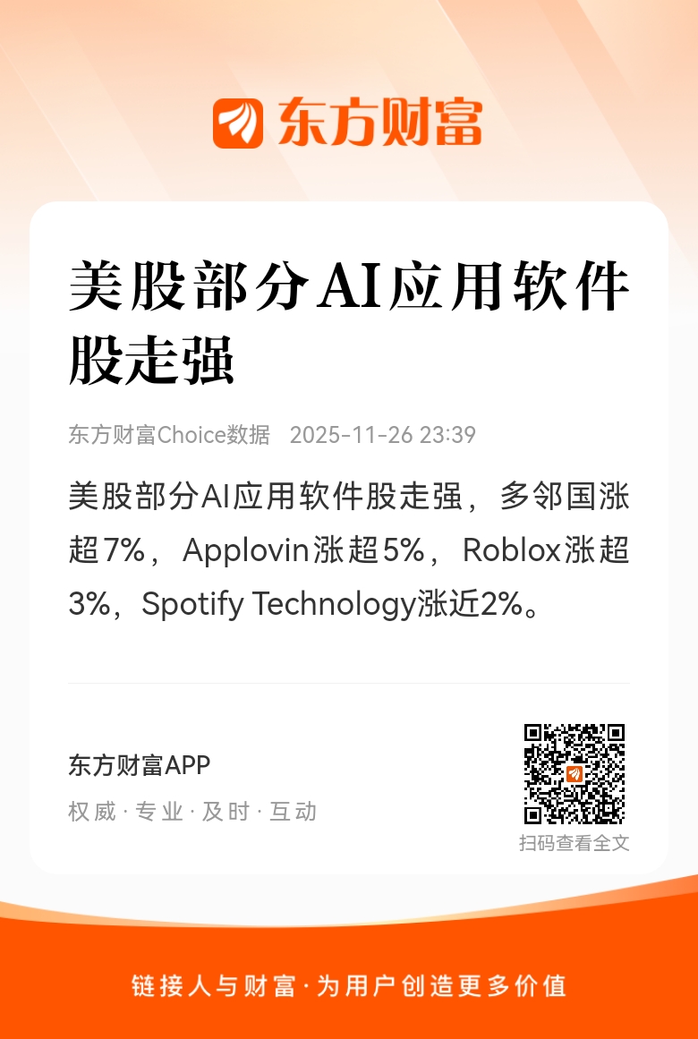 美股部分AI应用软件股走强,多邻国涨超7%,Applovin涨超5%,Roblox涨超3%,Spotify Technology涨近2%。